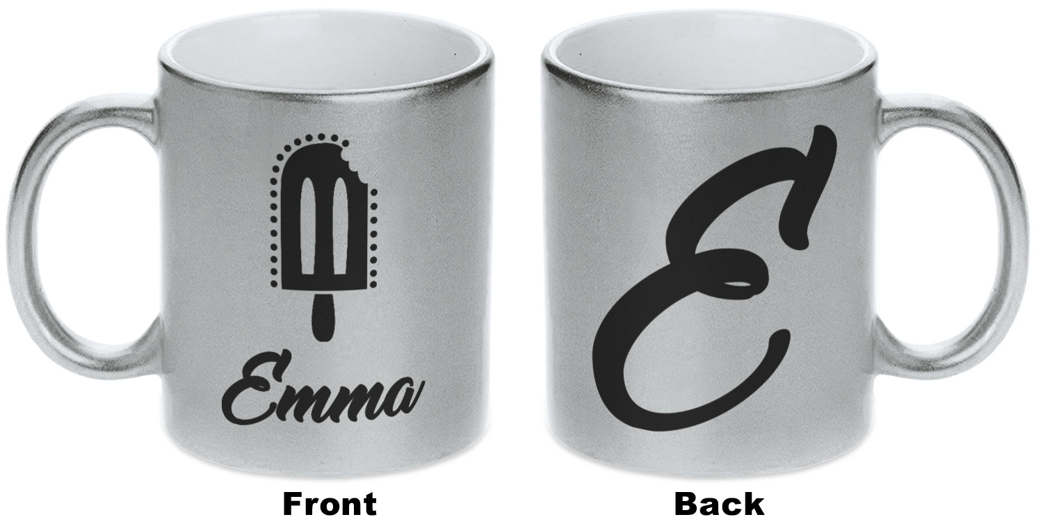 Our custom mugs are ceramic, which is great for keeping your tea or coffee warm! We offer two metallic mugs to personalize - Silver or Gold. Both styles hold around 11oz and have dimensions of approximately 3.75" x 3.5" x 4.75". Both the metallic mugs come in a matte finish and have glitter detailing to add a more pristine feel to the gold and silver base colors.