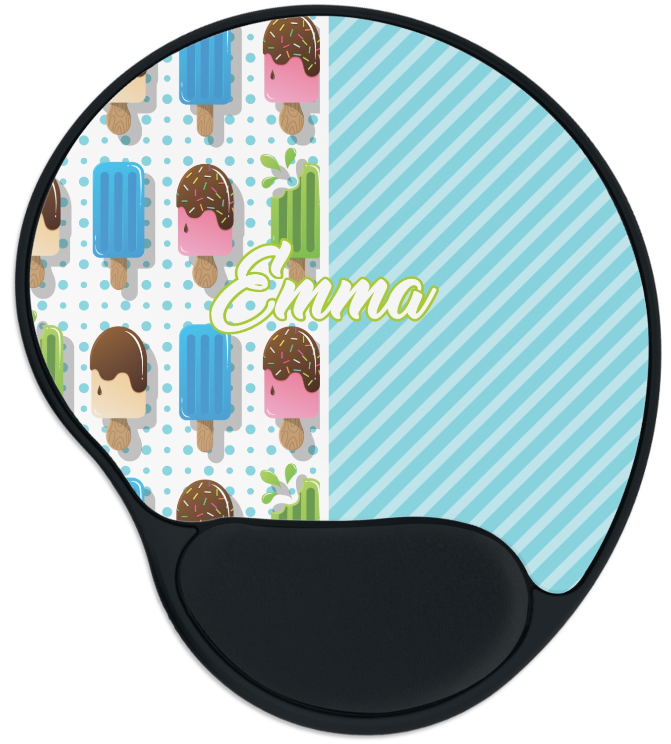 The top of these personalized mouse pads are made from a polyester, while the underside is plastic. The back of these mouse mats include rubber feet to prevent any slippage while in use. A padded wrist support, made from plush memory foam, occupies the bottom section of these computer mouse pads. Your customized design is printed onto the face of this mat, with the remaining sides and support piece colored in black. The mat itself is rounded and measures at 10.25" x 9.13".