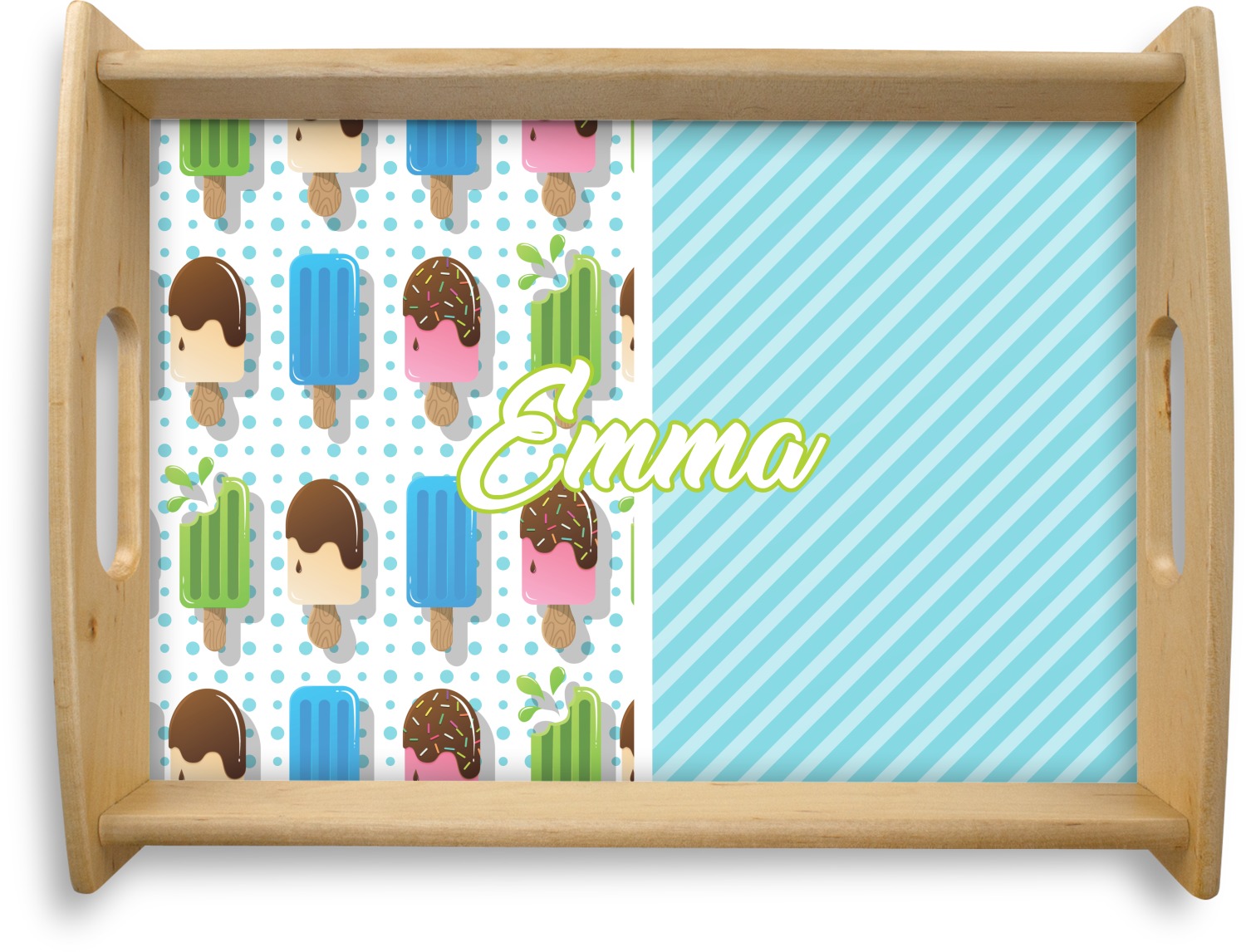 This design is a fun light teal, with pops of lime green and other bright colors. This design is split right down the middle so that you can have two fun patterns on either side The left half are four different kinds of popsicles that repeat in this cute design, with teal polka dots sitting behind them. On the other half is your fun slanted teal stripes pattern.