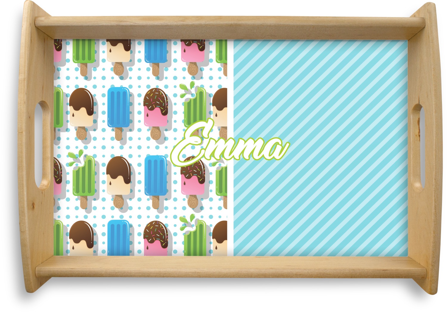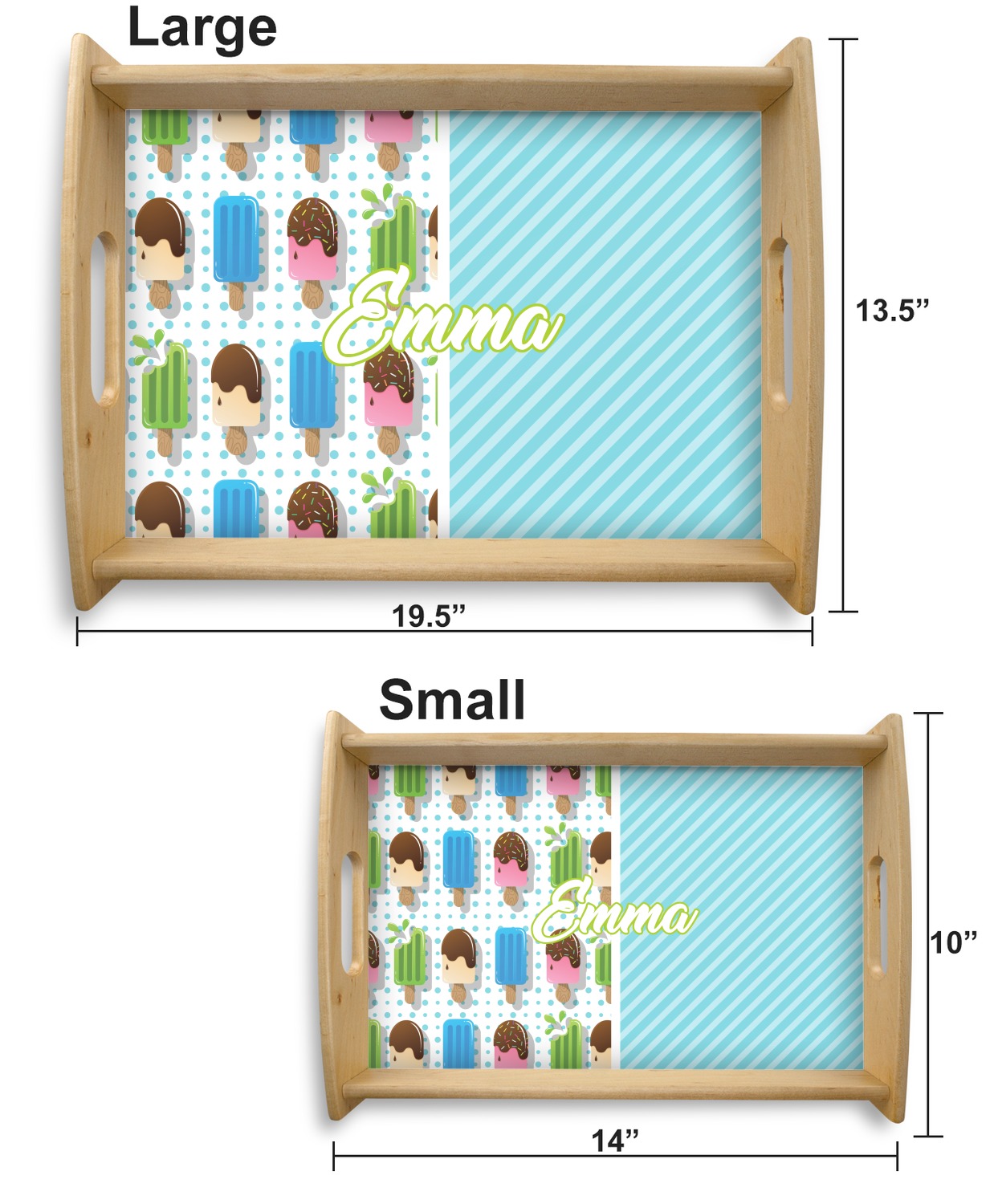 This serving tray with handles features square edges and two rounded sides, creating a very modern look. Each side is fabricated from a beautifully cut, natural wood. The bottom of the interior of the tray displays your customized design in bright, vibrant color. The tray is sold in both a black color and a natural wood look. Each variation of the wood serving tray has two sizes: Small, which is 14" x 10" x 2.25", and Large, which is 19.5" x 13.5" x 2.75".