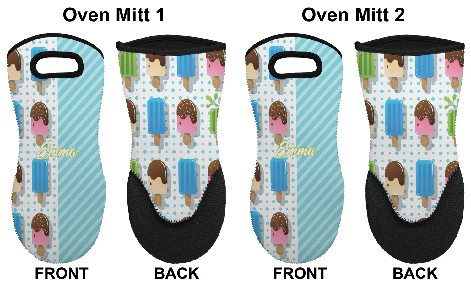 These heat resistant gloves are made entirely of a durable neoprene; the front features a softer texture, while the palm's side has a textured surface, meant to handle heat up to 500 degrees Fahrenheit. Thick, heavy duty stitching connects the two sides. A small, oval cutout appears on the front, and can be used to hang and store the mitt. Your personalization appears on the front, and the upper part of the back of the mitt. The style of these oven mitts are suitable for both the right and left hand, depending on your needs. If you need one for each hand, be sure to order two!
