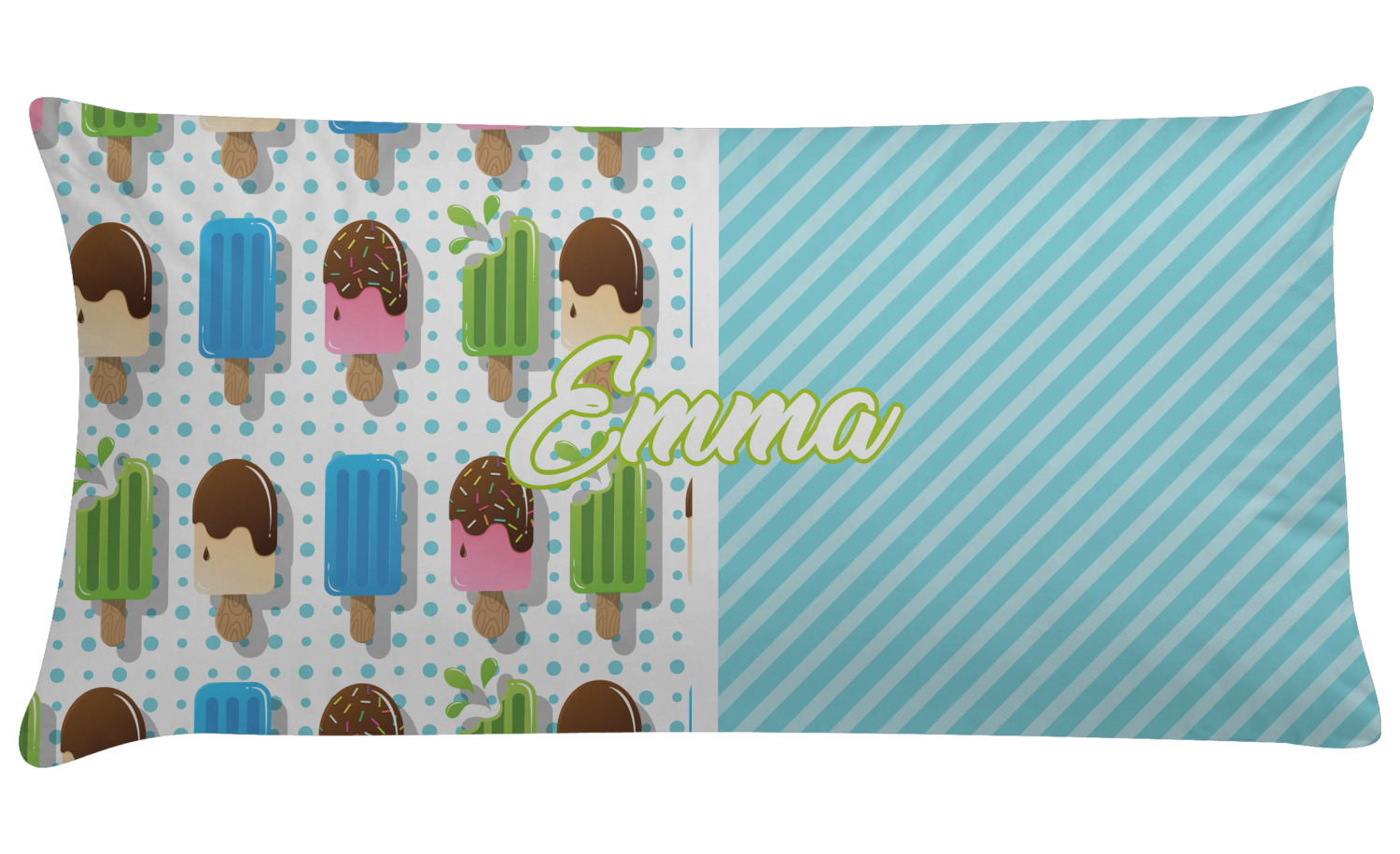 This design is a fun light teal, with pops of lime green and other bright colors. This design is split right down the middle so that you can have two fun patterns on either side The left half are four different kinds of popsicles that repeat in this cute design, with teal polka dots sitting behind them. On the other half is your fun slanted teal stripes pattern.
