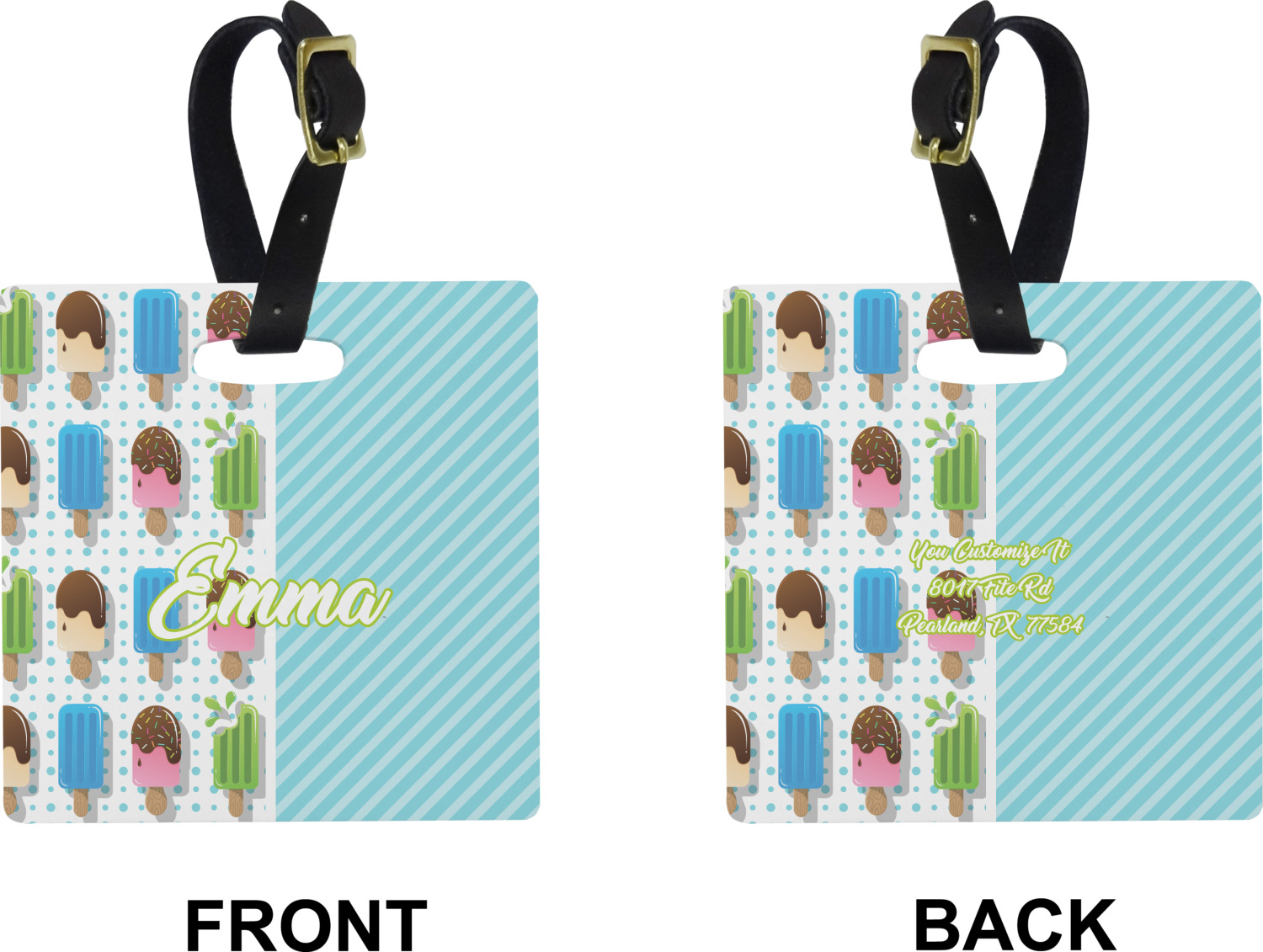 These cute luggage tags are made of a fiber-reinforced, UV-resistant plastic, making them waterproof and durable enough for both everyday use and the rugged adventures of any traveler! A leather strap with holes and a buckle is included with your purchase and can be used to attach your custom luggage tag to any suitcase, backpack, or duffel bag. You can design these travel tags as you wish; your customization will be displayed across the front, while the back will show as little or as much personal information as you want.