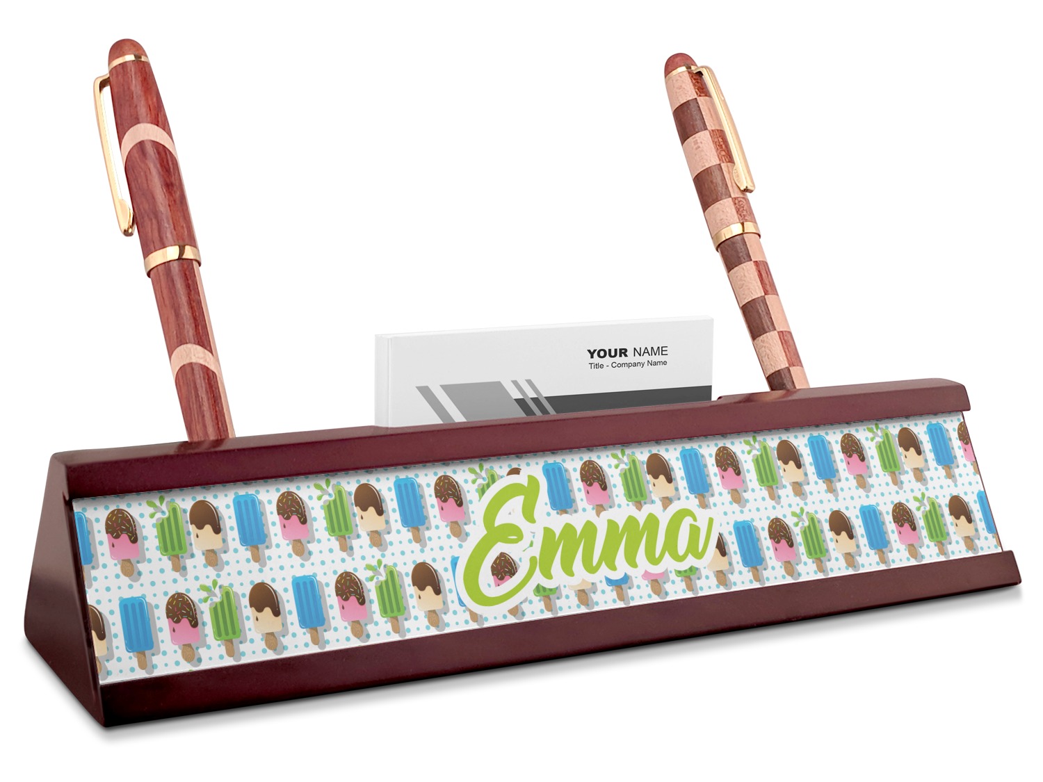 Your desk name plates are crafted from a high-quality, dark-cherry mahogany. At approximately 9.5 by 1.875 by 2.5 inches, this name plaque will fit perfectly, front and center, on your desk. Your customization spans across the entire face of the nameplate. Behind the nameplate lies a skinny slot that can fit approximately 15, traditionally-sized, business cards. You can also store your writing utensils on either side of this custom desk name plate.