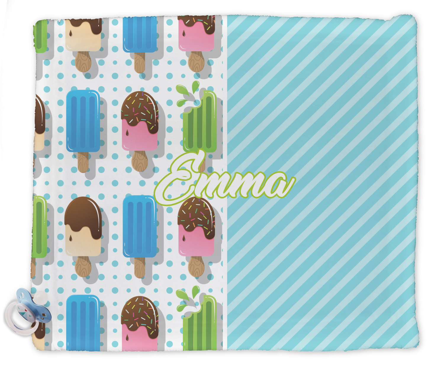 This design is a fun light teal, with pops of lime green and other bright colors. This design is split right down the middle so that you can have two fun patterns on either side The left half are four different kinds of popsicles that repeat in this cute design, with teal polka dots sitting behind them. On the other half is your fun slanted teal stripes pattern.