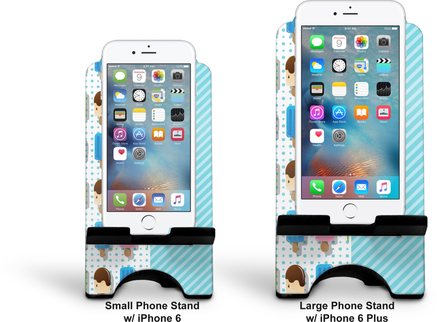 To meet your needs, we offer four variations of this IPhone stand. The backboard of the first version is shaped as a plain, yet sleek rectangle, and is available in two sizes. Our smaller size is approximately 4 by 3.25 by 7 inches, while the larger model is 4 by 3.77 by 8.5 inches. Alongside this model, we also provide you with a more decorative option. The upper part of our second version features a curved edge, for a classy, suave appearance. This phone holder is also sold in two sizes: a smaller version, which is 4 by 3.25 by 7 inches, and our larger model, which is 4 by 3.77 by 8.5 inches. Both models will support large phones, but the larger model is better if you wish to proudly display your personalized design.