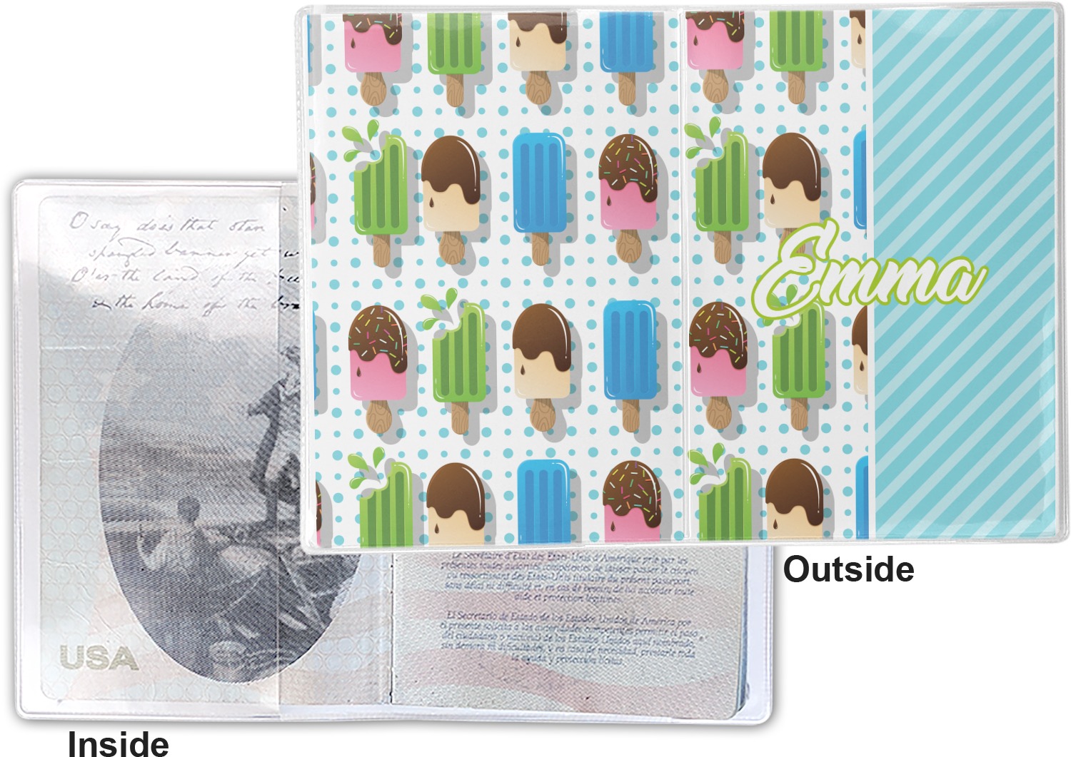 This cover is made of a sturdy clear vinyl with a personalized vinyl insert inside. There is a large and a small pocket on either side to hold the covers of your passport easily and firmly. The passport holder is approximately 7.5" x 5.25", the perfect size to snugly fit your passport. This slim cover is the perfect way to protect your passport without being one more bulky item you have to carry.