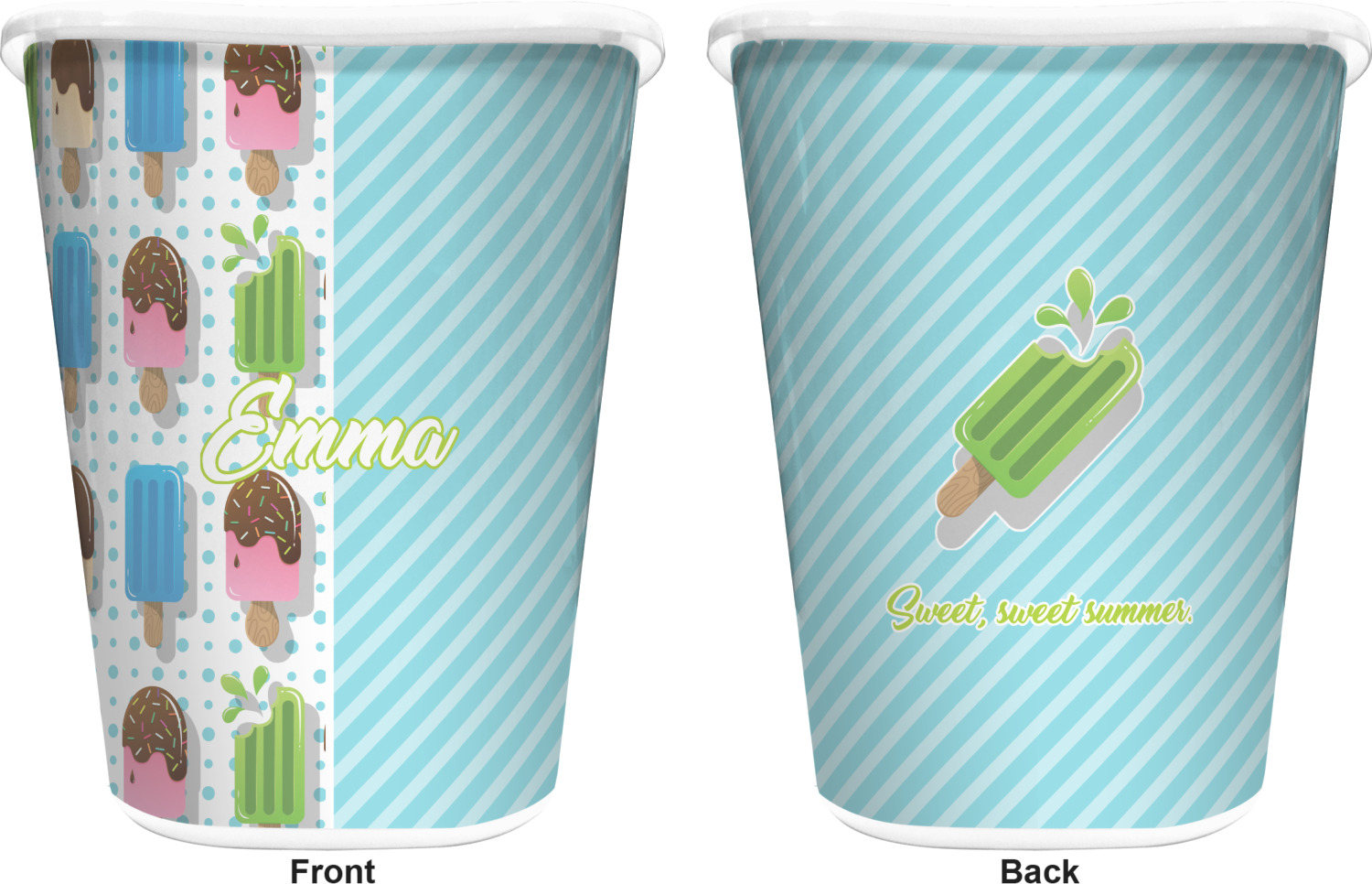 You can choose to purchase these decorative wastebaskets in either a white or a black color that will show on the base and the upper rim. Your customization is printed on a high-gloss, fine-quality vinyl adhesive, and you can choose to either have this adhesive applied to one side only or to both sides. As such, this plastic wastebasket can be single-sided or double-sided, depending on your creative vision. Your customization is printed using durable inks, making the design waterproof and resistant to fading over time.