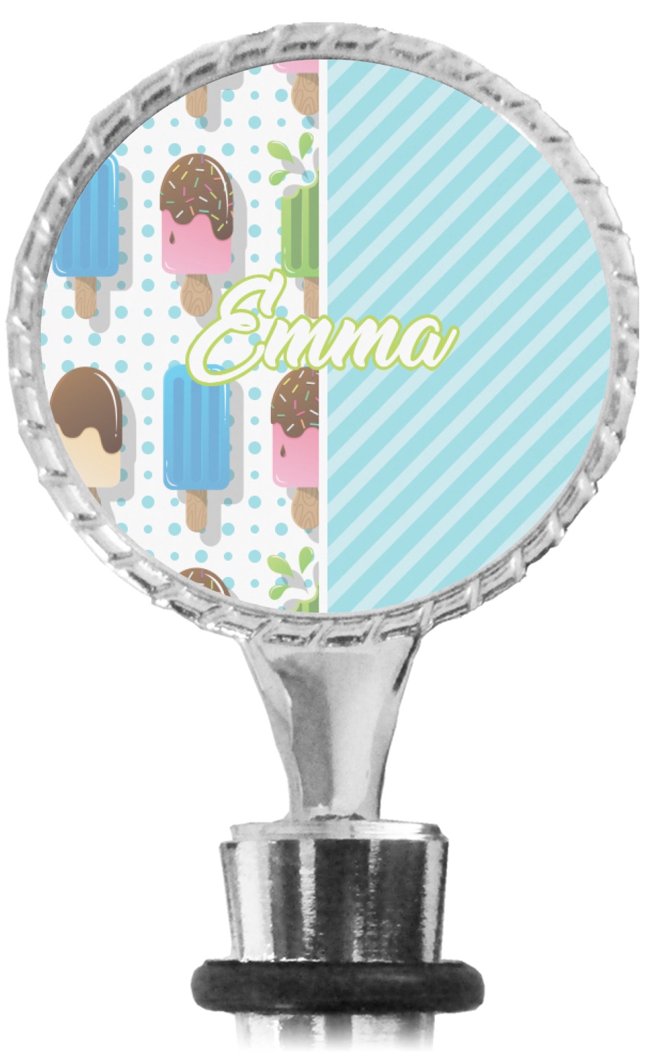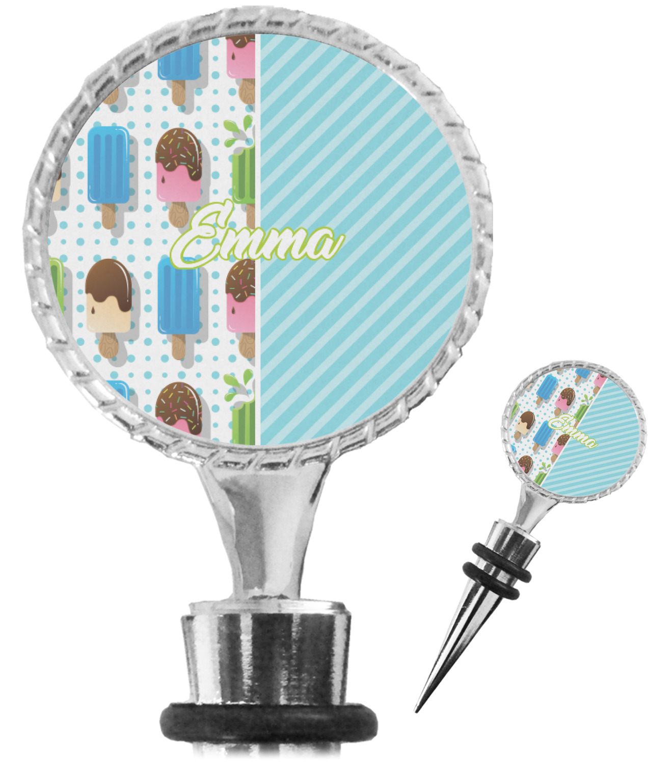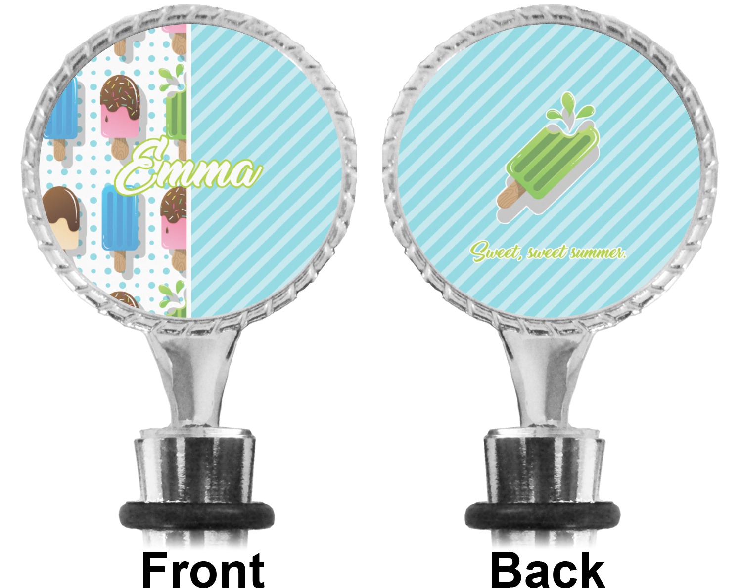 The top part of your bottle stopper is comprised of a zinc ring that displays your customization(s) in its middle, on both sides. The ring is heavy duty, with a bright chrome finish. The body of the wine stoppers have two silicone rings to provide an airtight seal. These wine bottle stoppers measure at 1.625" L x 0.8125" W x 4.625" H; your custom wine stopper is meant to fit into most standard-sized wine bottles.