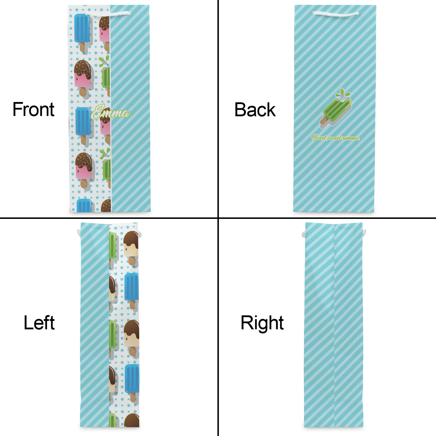 This design is a fun light teal, with pops of lime green and other bright colors. This design is split right down the middle so that you can have two fun patterns on either side The left half are four different kinds of popsicles that repeat in this cute design, with teal polka dots sitting behind them. On the other half is your fun slanted teal stripes pattern.