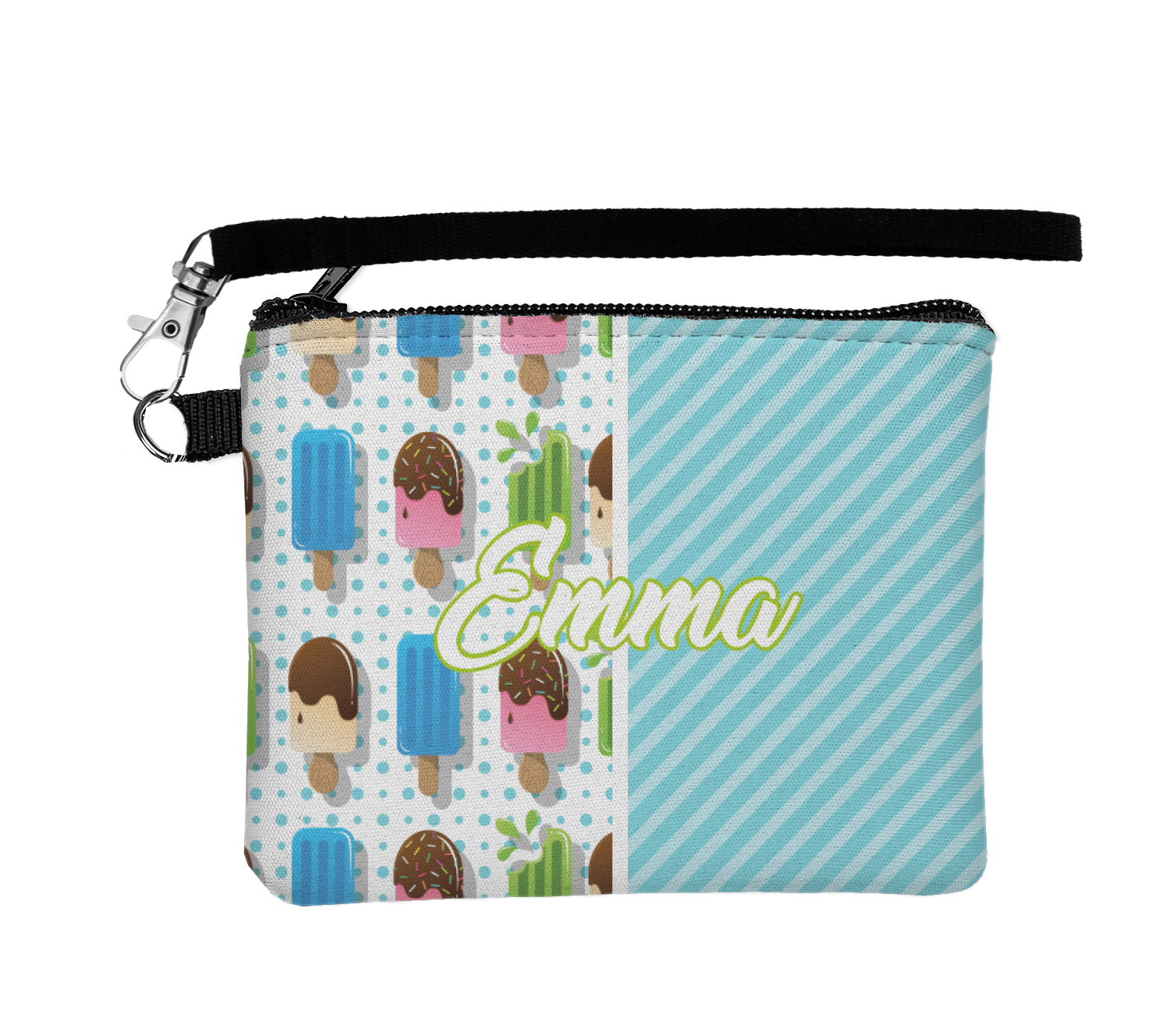 This design is a fun light teal, with pops of lime green and other bright colors. This design is split right down the middle so that you can have two fun patterns on either side The left half are four different kinds of popsicles that repeat in this cute design, with teal polka dots sitting behind them. On the other half is your fun slanted teal stripes pattern.