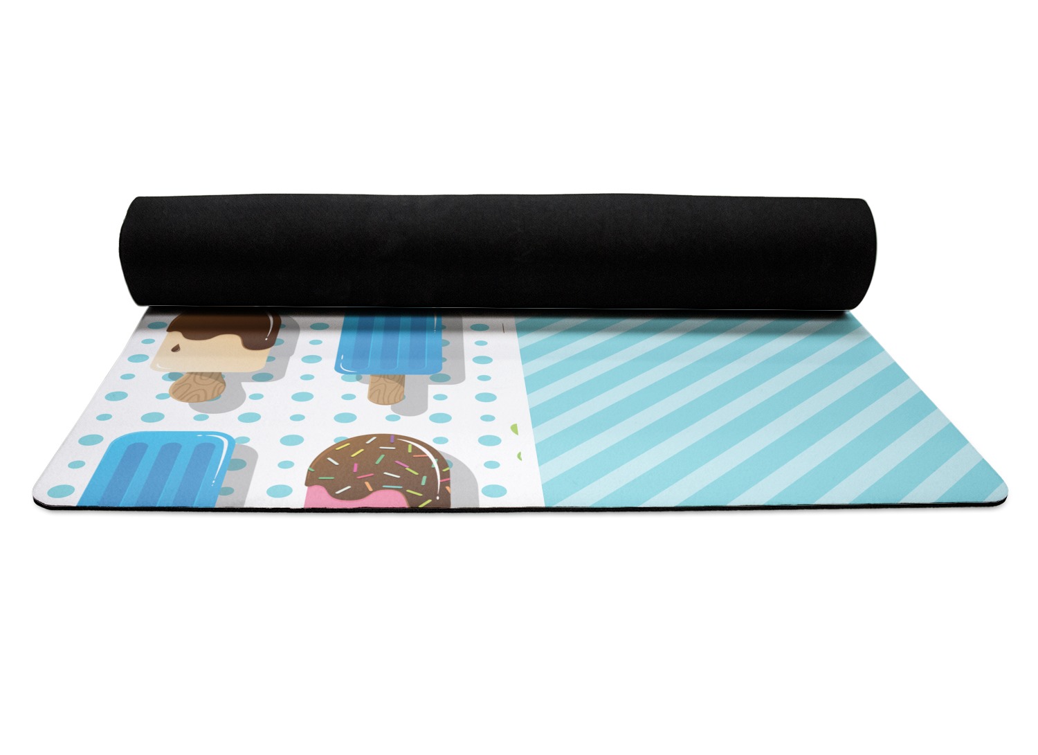 The top of the mats are dyed with your design using eco friendly non solvent inks. They have a smooth fleece felt top and feels very soft. The back of the mat is a sleek black and is a squishy non-slip texture to ensure that your mat does not slip on the floor. Our rubber backed mats are the perfect size at 68" x 24" and are just under approximately 1/4 inch thickness.