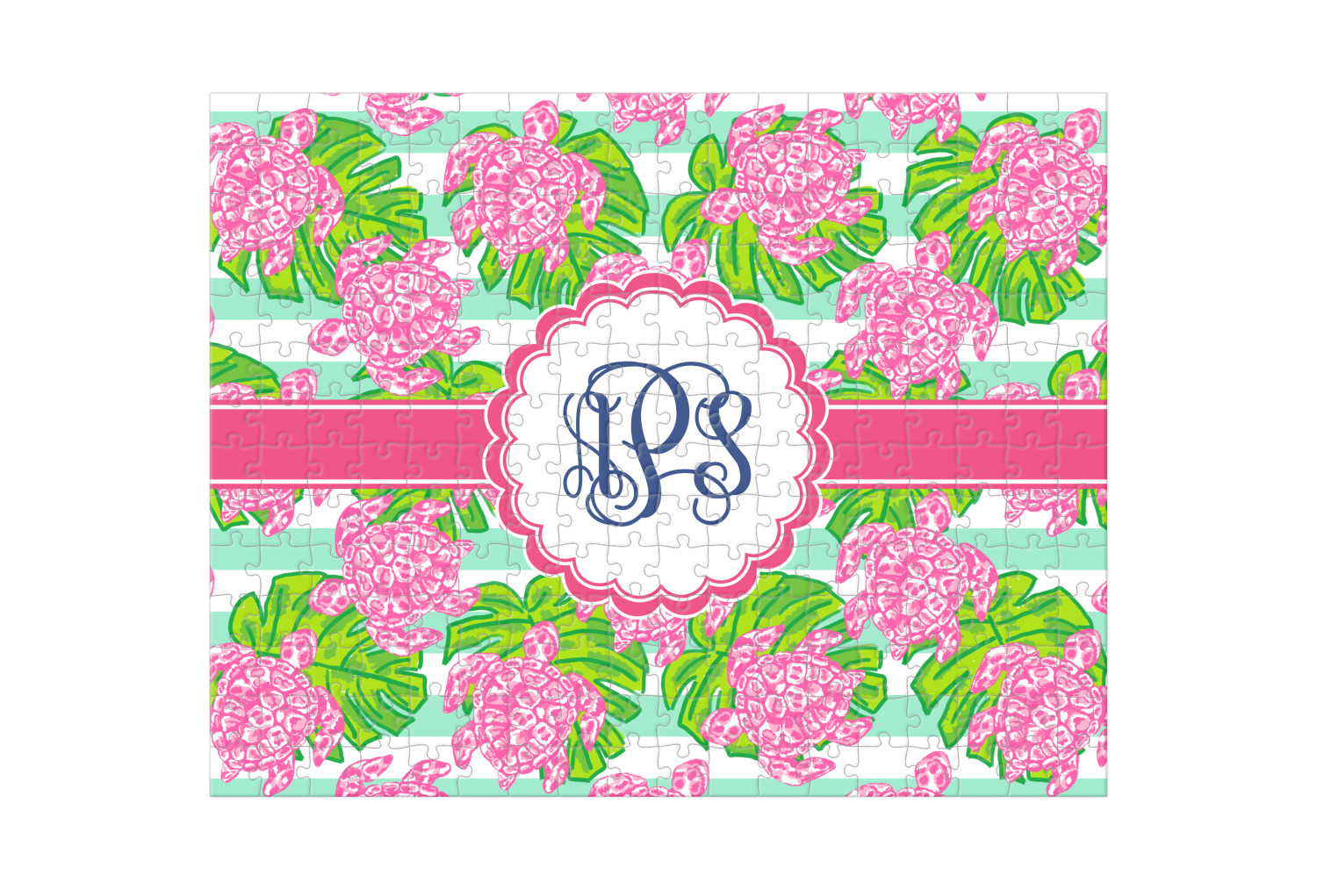 Looking for something Preppy? This design has gorgeous flashy pinks and greens and, of course, monograms! The main design is layered with mint & white stripes, beautiful green leaves and some adorable pink turtles. This will be the perfect design for a typical college girl!