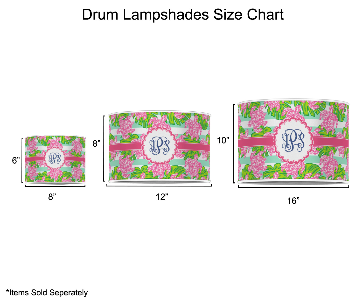 Our customized lamp shades also come in 3 different sizes: 8", 12" and 16", measuring at 8" in diameter by 6" tall, 12" in diameter by 8" tall, and 16" in diameter by 10" tall, respectively.
