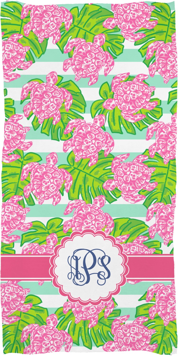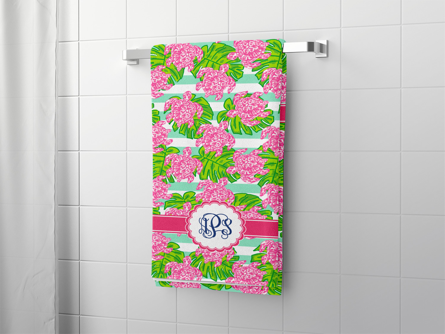 Looking for something Preppy? This design has gorgeous flashy pinks and greens and, of course, monograms! The main design is layered with mint & white stripes, beautiful green leaves and some adorable pink turtles. This will be the perfect design for a typical college girl!