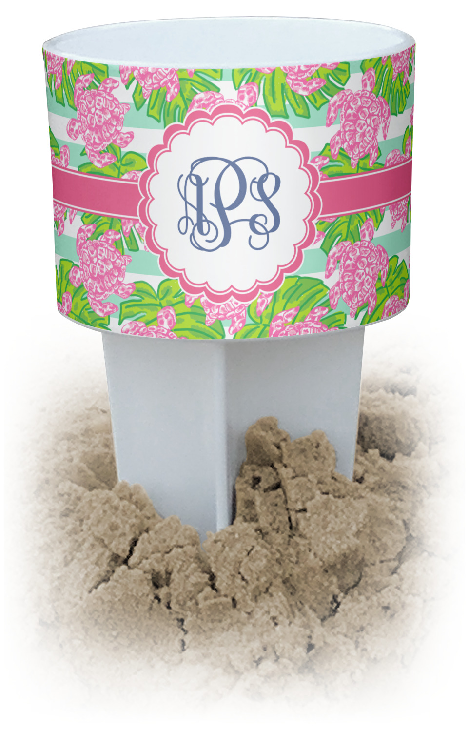 This cup holder has a large stake at its bottom that anchors it to the sand or ground below, while the cup holder rests above the stake. The entire drink holder is made of durable plastic and displays your customization around the cup holder portion. We sell these personalized beach spikers in two different colors: black and white.