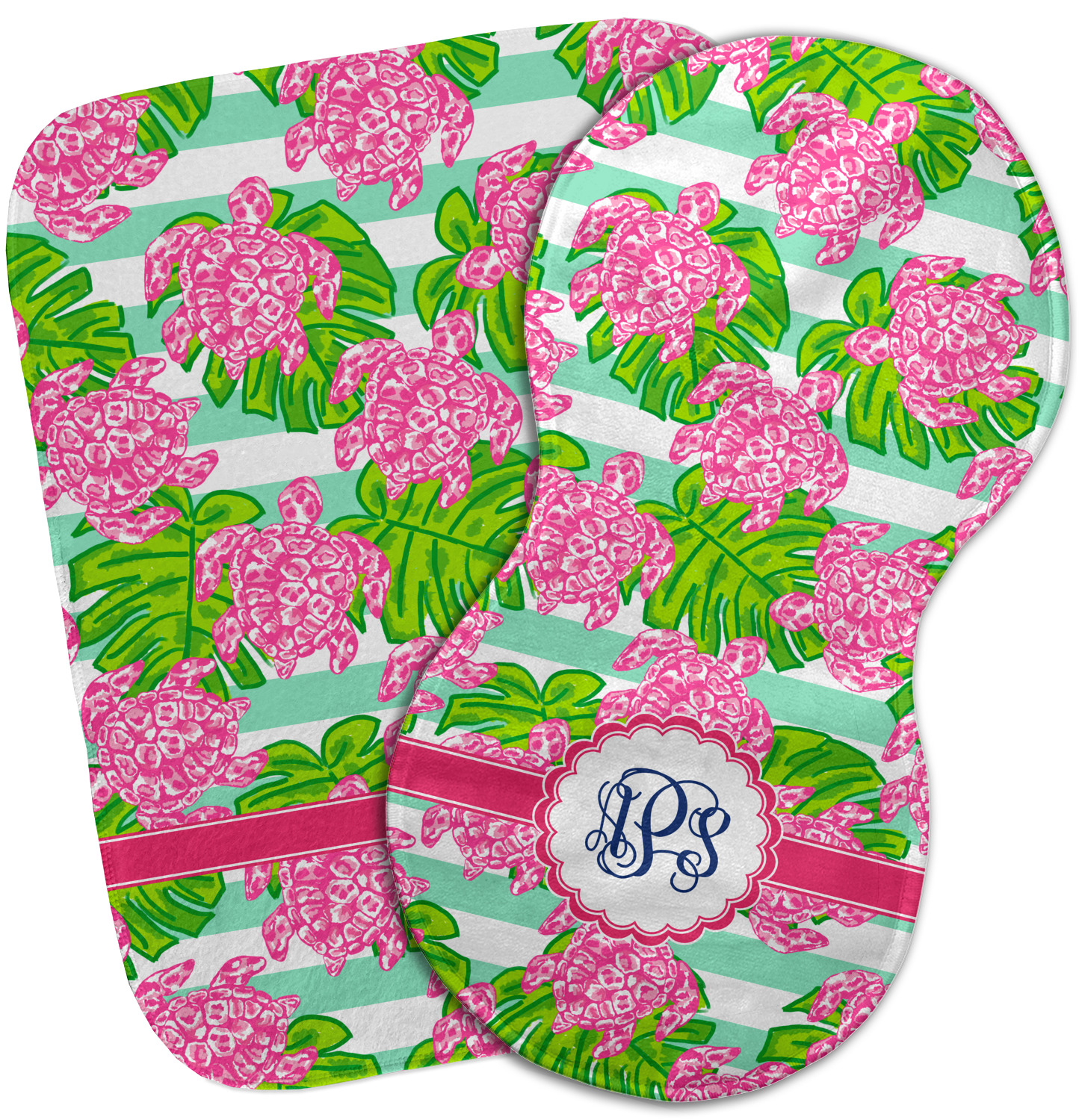 Looking for something Preppy? This design has gorgeous flashy pinks and greens and, of course, monograms! The main design is layered with mint & white stripes, beautiful green leaves and some adorable pink turtles. This will be the perfect design for a typical college girl!