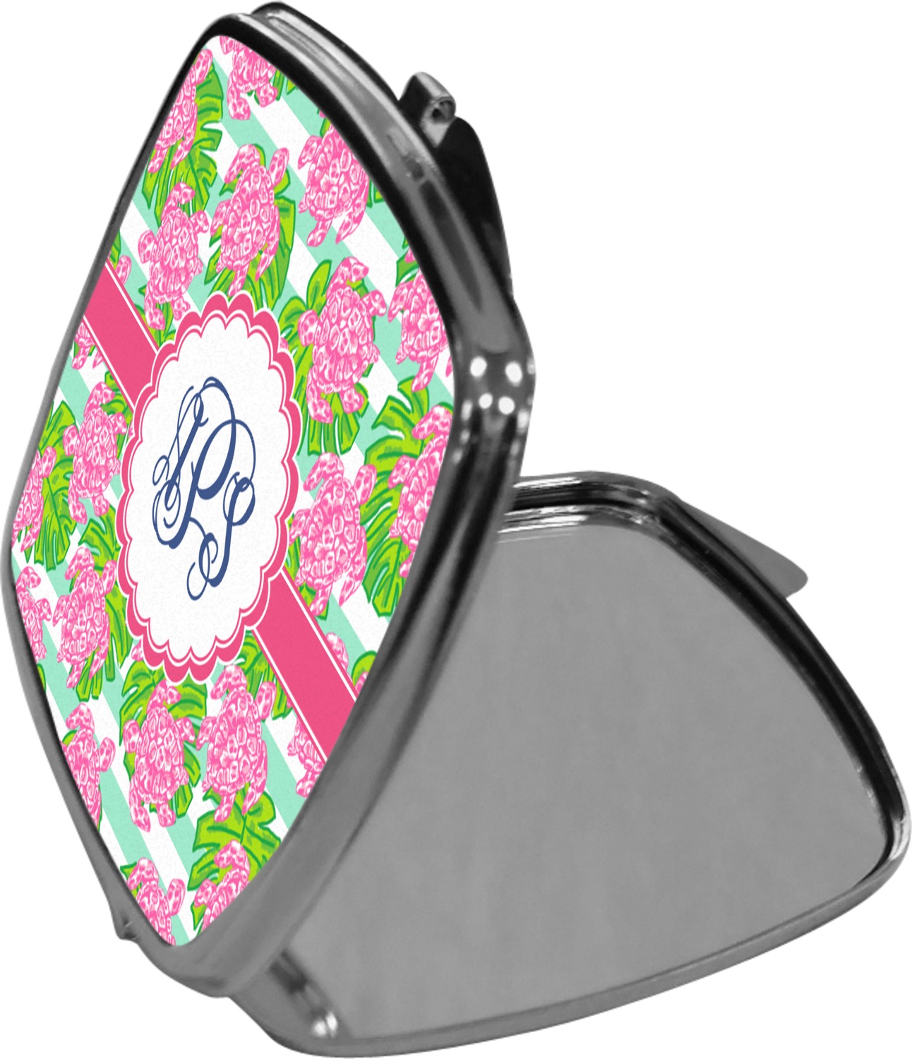 Our compact mirrors are customized with your design on one side. The other side is patterned silver tone metal. Inside, there are two mirrors.