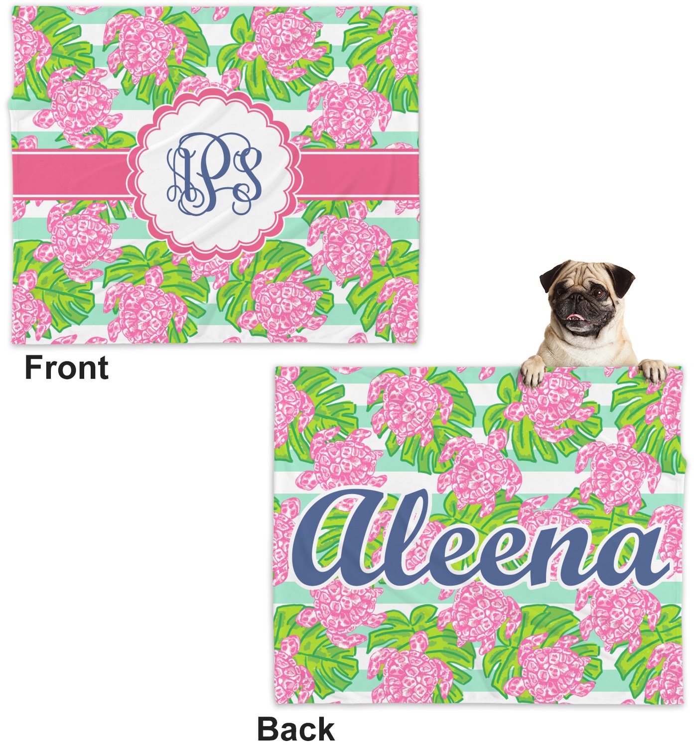 These dog blankets are crafted from a gentle, soft-to-the-touch, minky material. We print your customizations, either matching or differing, on both the top and underside of the blanket. These personalized dog blankets are available in two sizes: regular and large. Our regular size, at 40" x 30", accommodates small and some medium size dogs. At 60" x 50", our large dog blanket is a better fit for bigger breeds. Though specialized for dogs, these blankets still make a thoughtful gift for your favorite feline, or any other pet in mind!