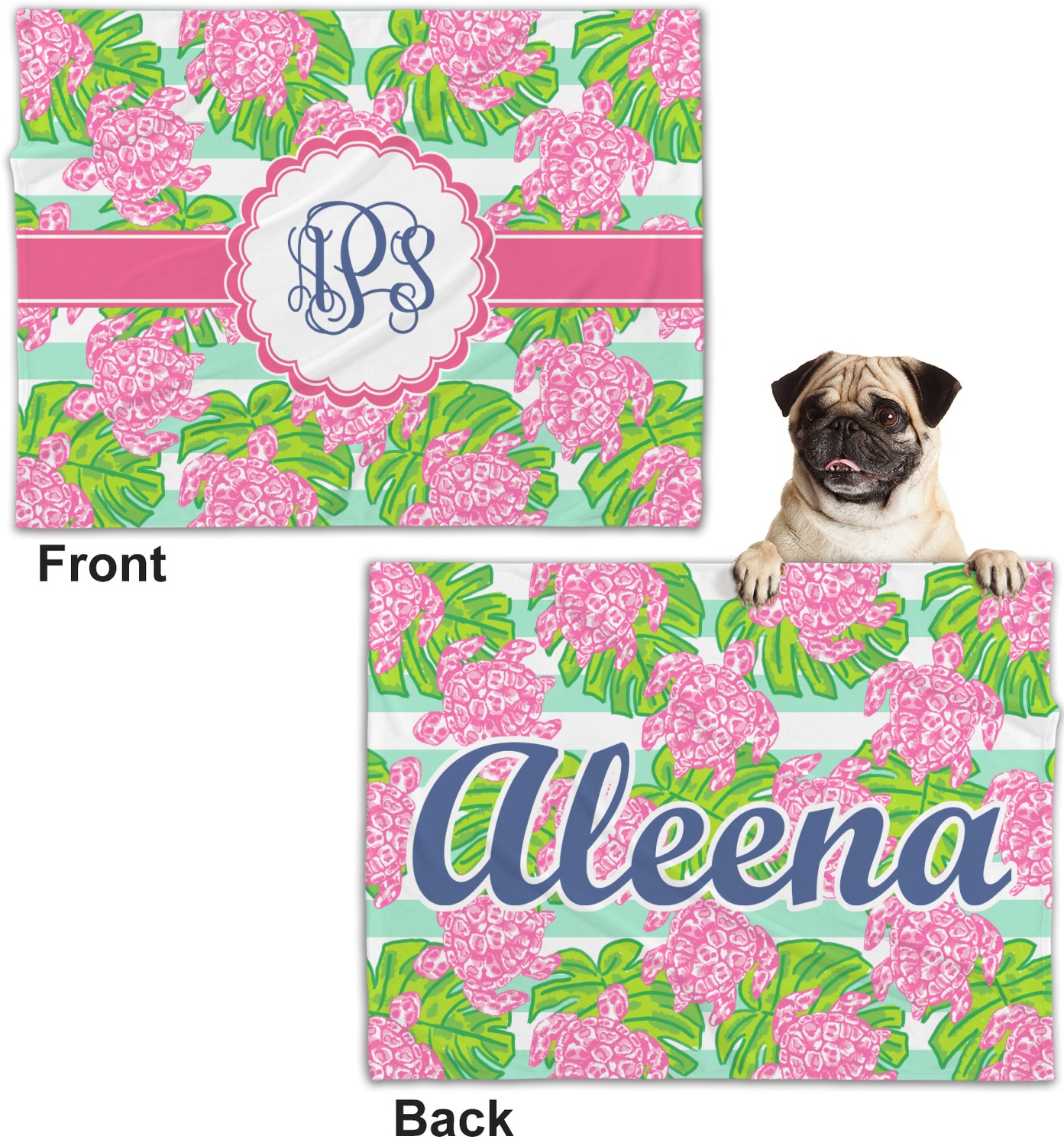 These dog blankets are crafted from a gentle, soft-to-the-touch, minky material. We print your customizations, either matching or differing, on both the top and underside of the blanket. These personalized dog blankets are available in two sizes: regular and large. Our regular size, at 40" x 30", accommodates small and some medium size dogs. At 60" x 50", our large dog blanket is a better fit for bigger breeds. Though specialized for dogs, these blankets still make a thoughtful gift for your favorite feline, or any other pet in mind!