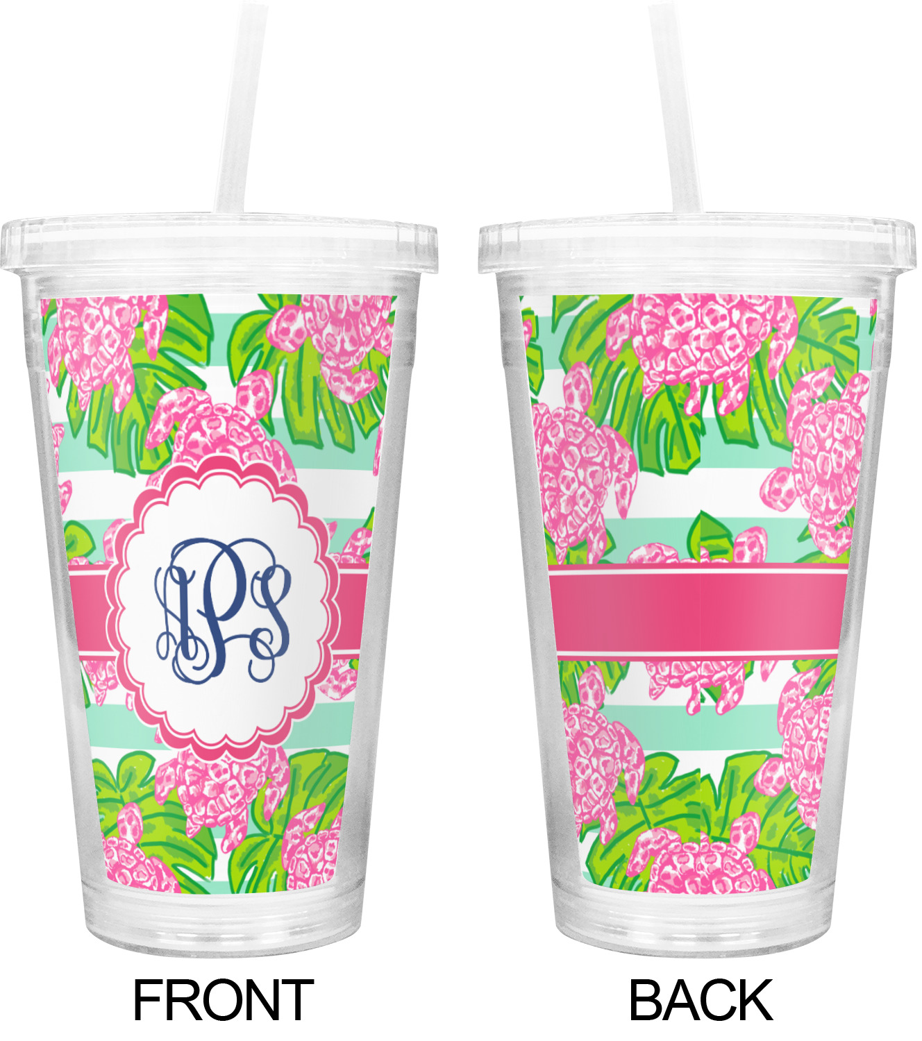 Looking for something Preppy? This design has gorgeous flashy pinks and greens and, of course, monograms! The main design is layered with mint & white stripes, beautiful green leaves and some adorable pink turtles. This will be the perfect design for a typical college girl!