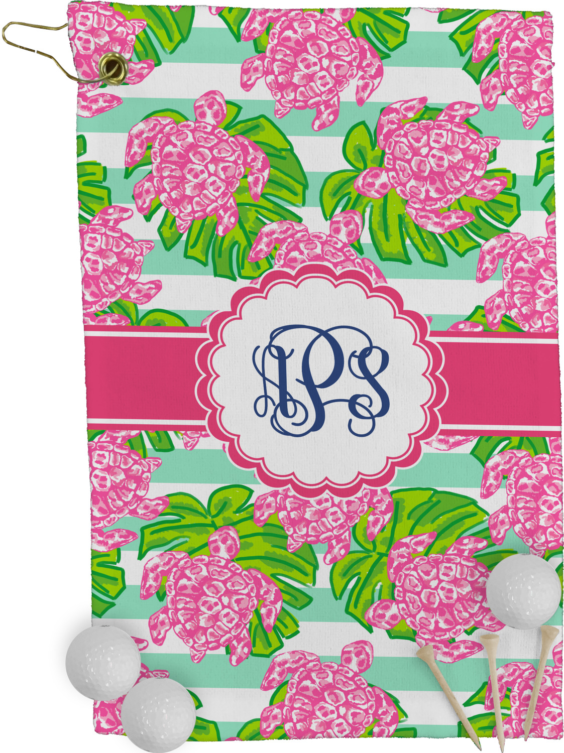 Looking for something Preppy? This design has gorgeous flashy pinks and greens and, of course, monograms! The main design is layered with mint & white stripes, beautiful green leaves and some adorable pink turtles. This will be the perfect design for a typical college girl!