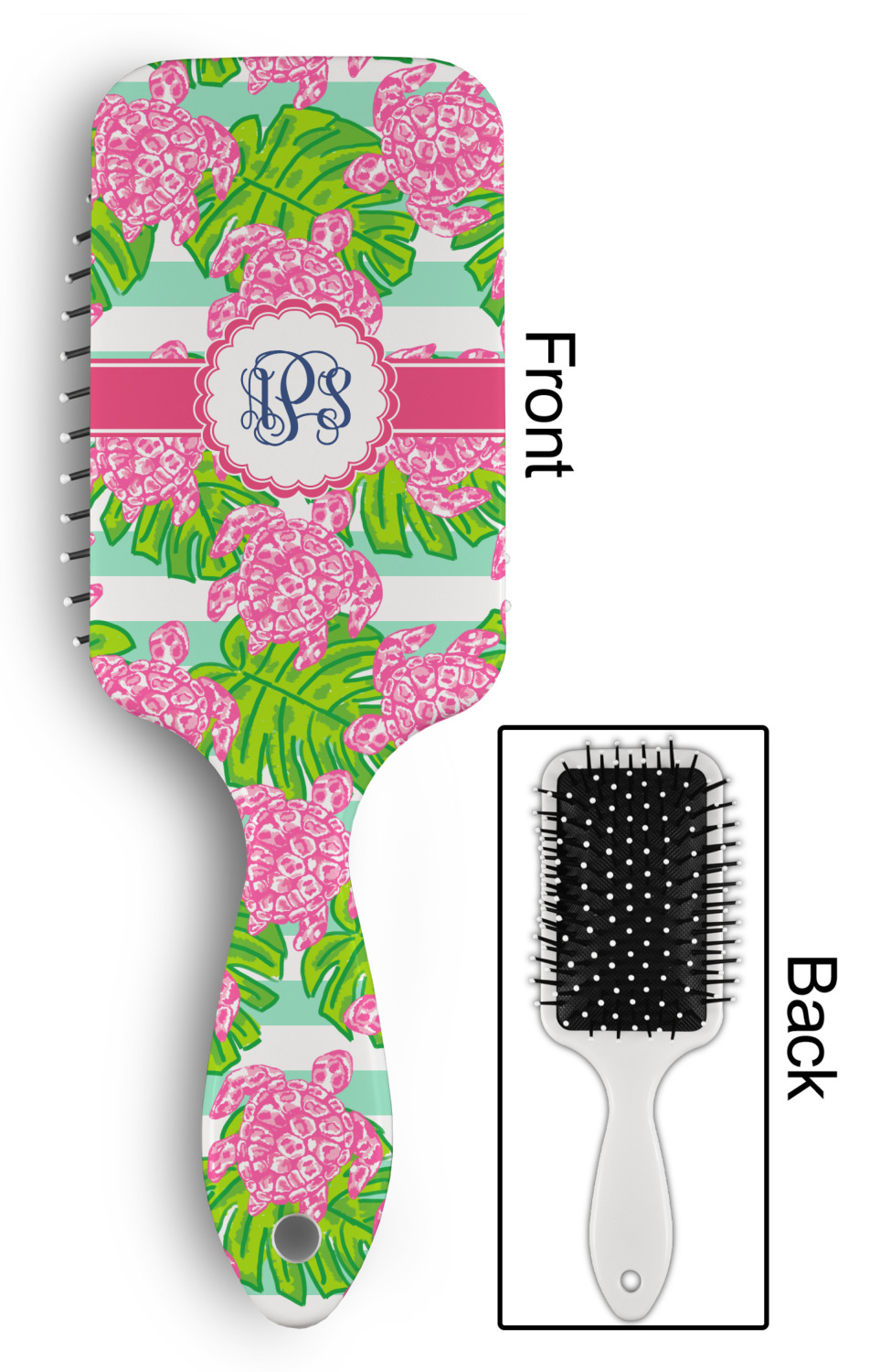 Your designed is printed on the front of the brush.; The back handle and sides are white.