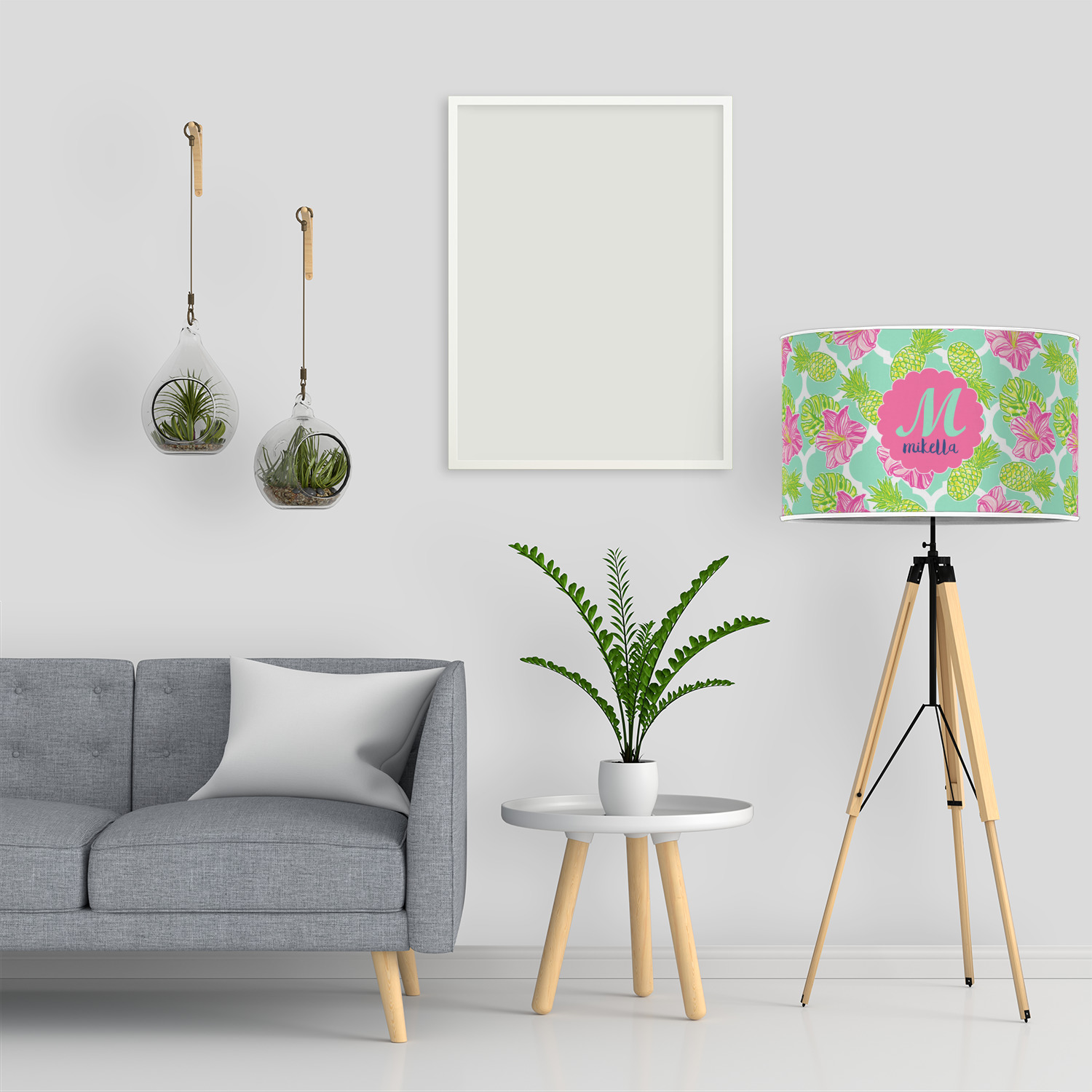 The background is a mint and white Moroccan lattice with brightly colored hibiscus flowers and pineapples. A scalloped frame sits in the center of the design with a fun name and initial personalization. With all of the fun bright yellows, greens, and pinks, you will just fawn over this design.