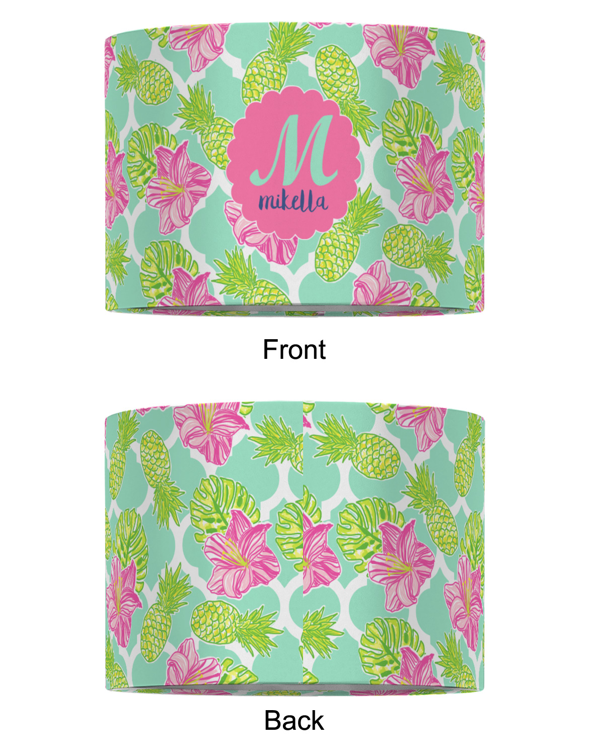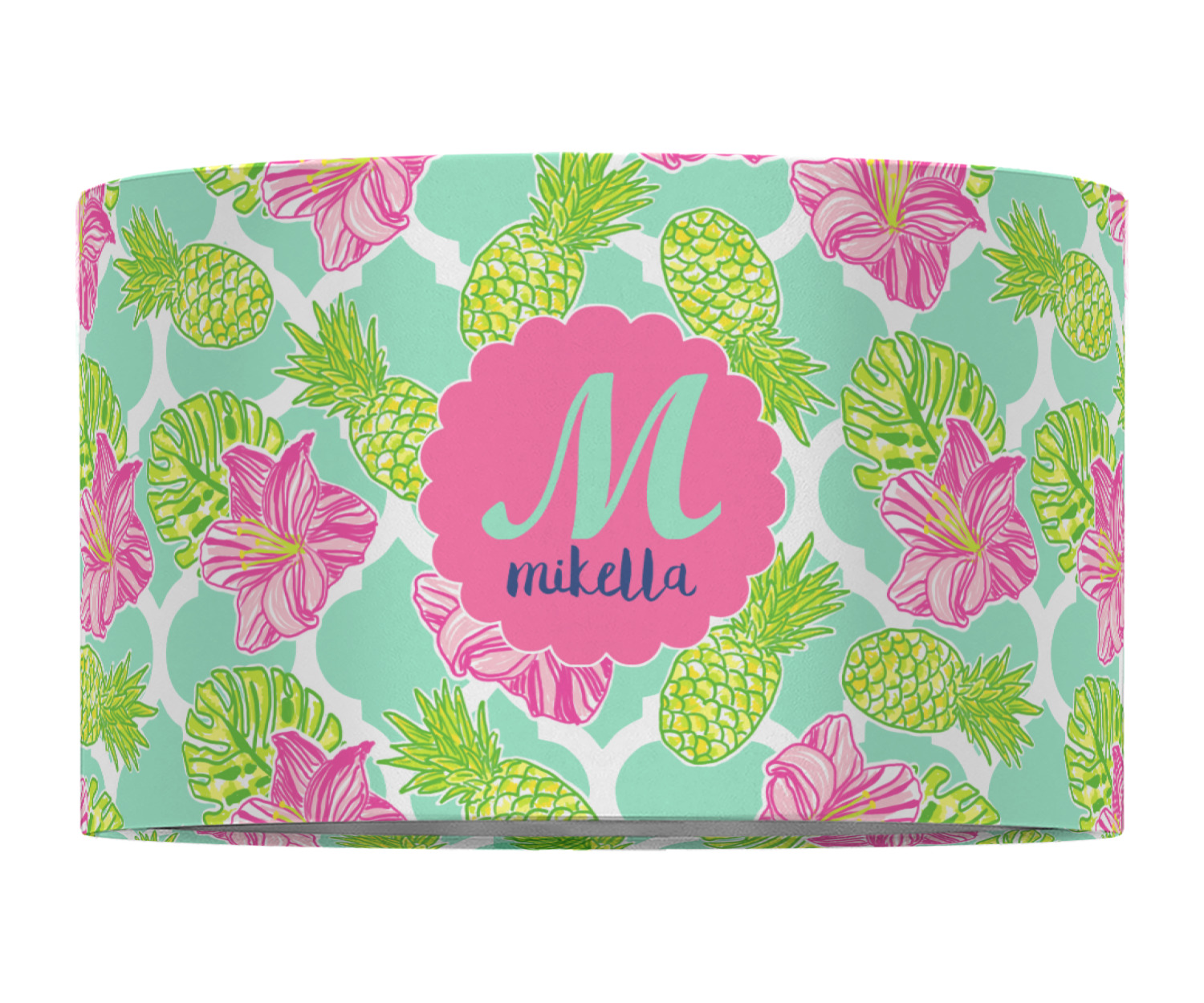 The background is a mint and white Moroccan lattice with brightly colored hibiscus flowers and pineapples. A scalloped frame sits in the center of the design with a fun name and initial personalization. With all of the fun bright yellows, greens, and pinks, you will just fawn over this design.