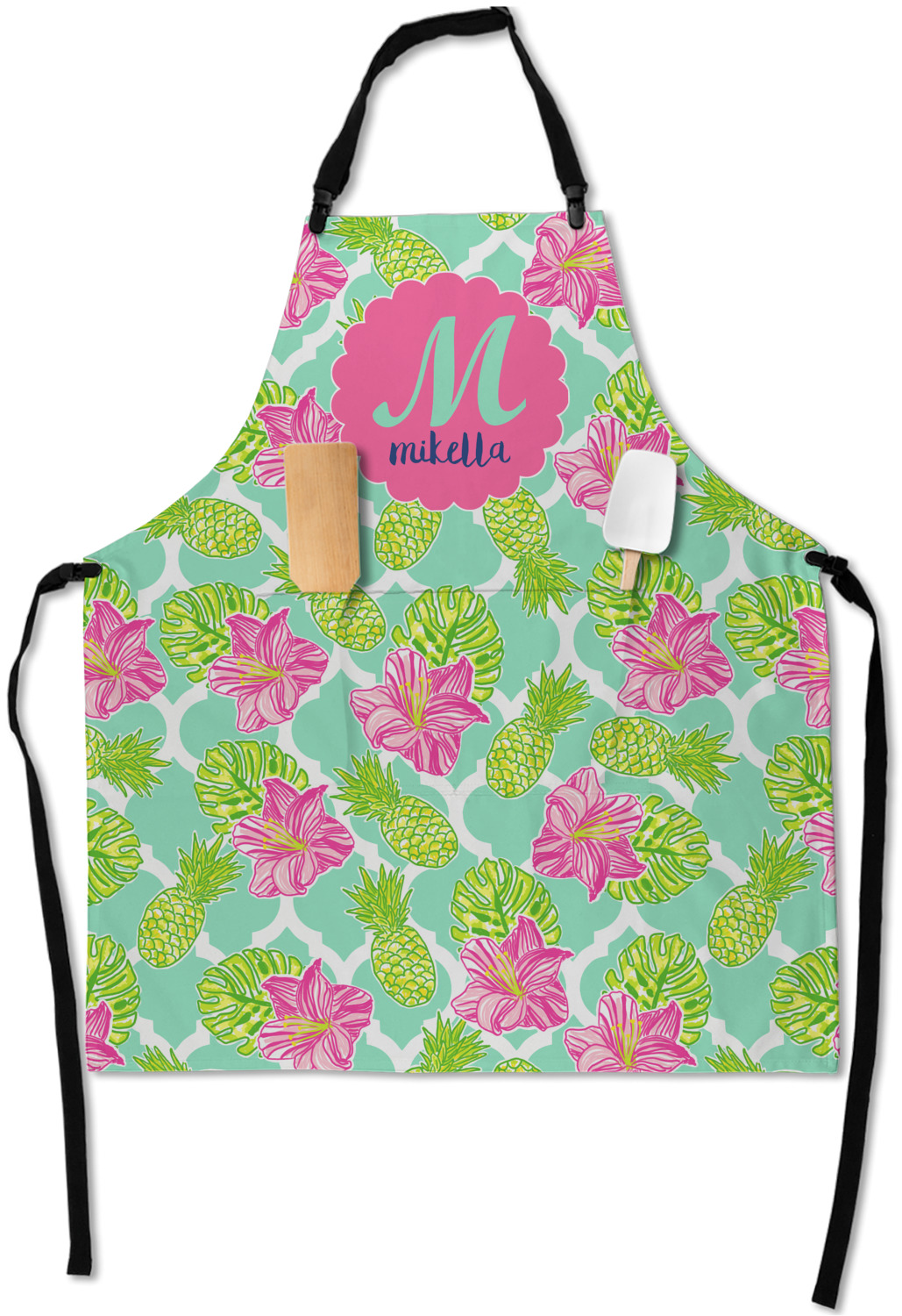 The background is a mint and white Moroccan lattice with brightly colored hibiscus flowers and pineapples. A scalloped frame sits in the center of the design with a fun name and initial personalization. With all of the fun bright yellows, greens, and pinks, you will just fawn over this design.