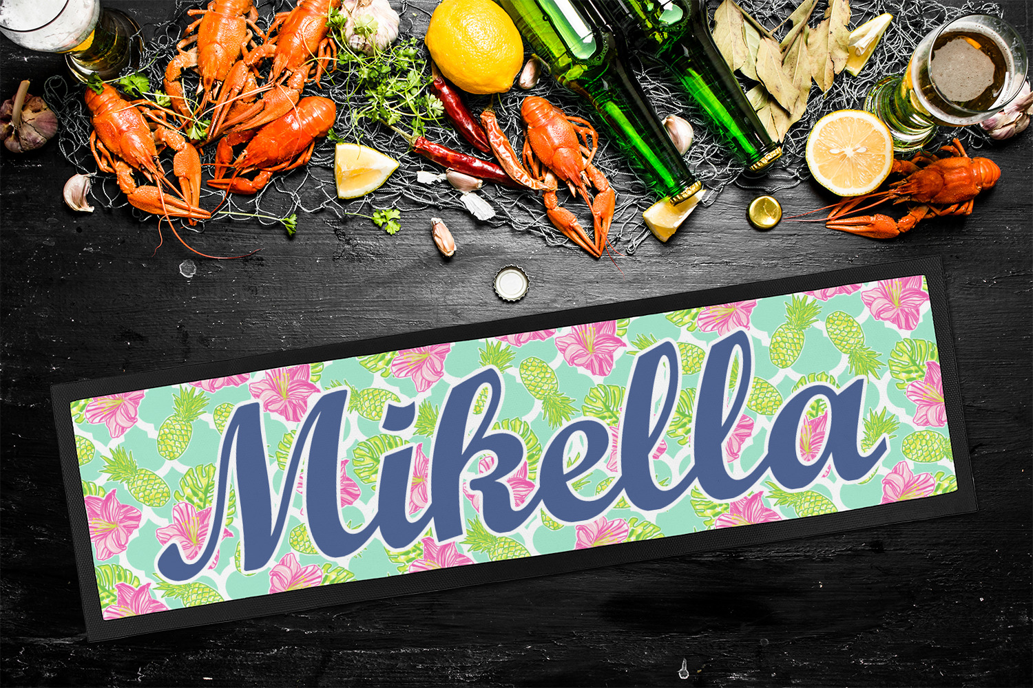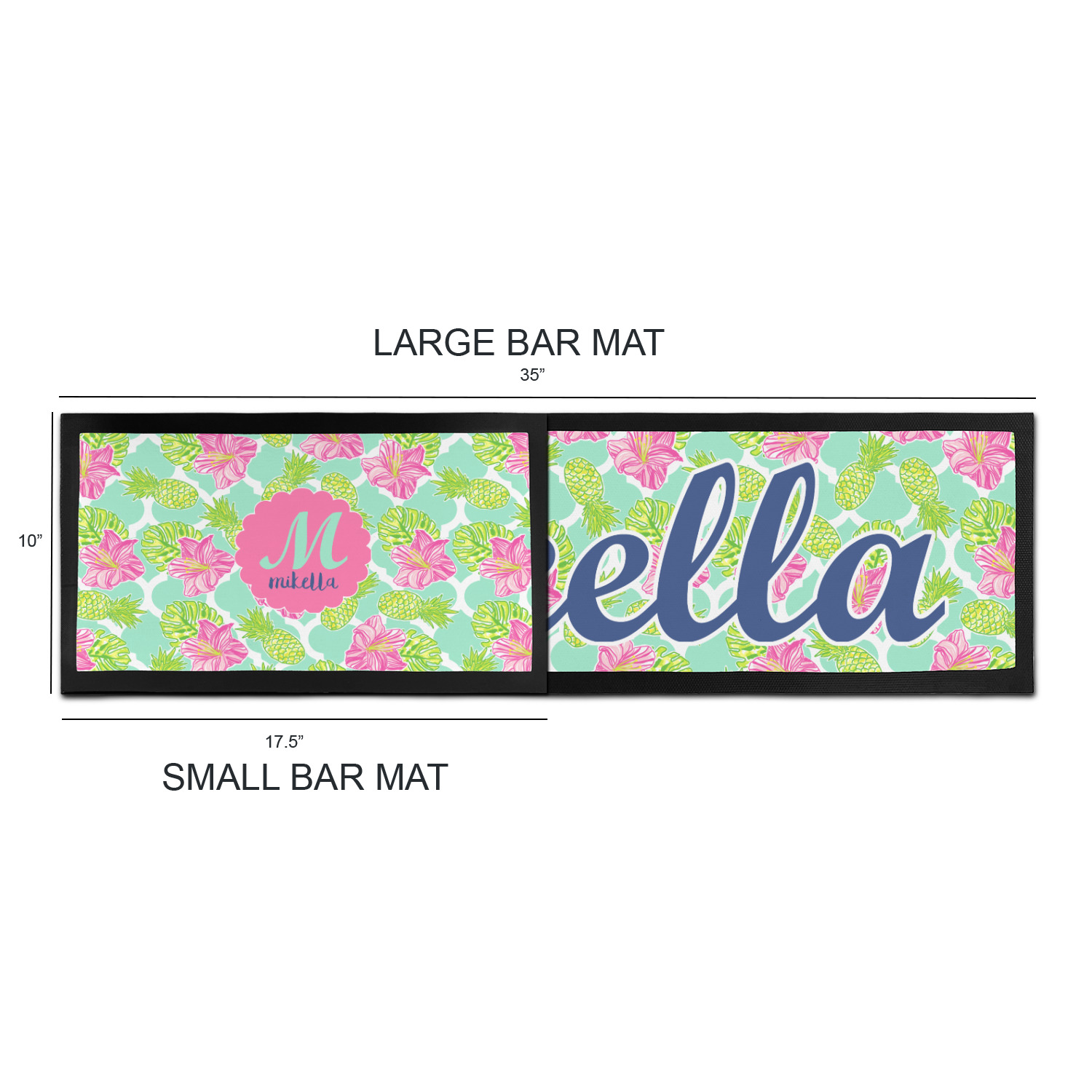 The background is a mint and white Moroccan lattice with brightly colored hibiscus flowers and pineapples. A scalloped frame sits in the center of the design with a fun name and initial personalization. With all of the fun bright yellows, greens, and pinks, you will just fawn over this design.