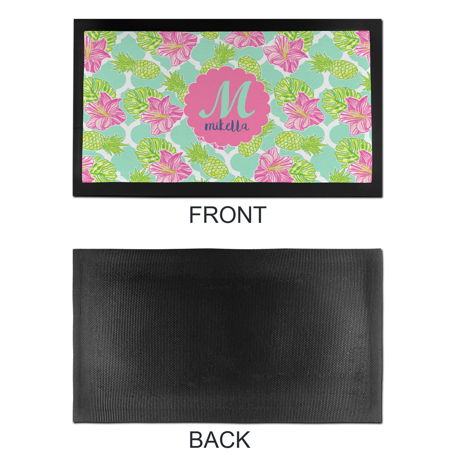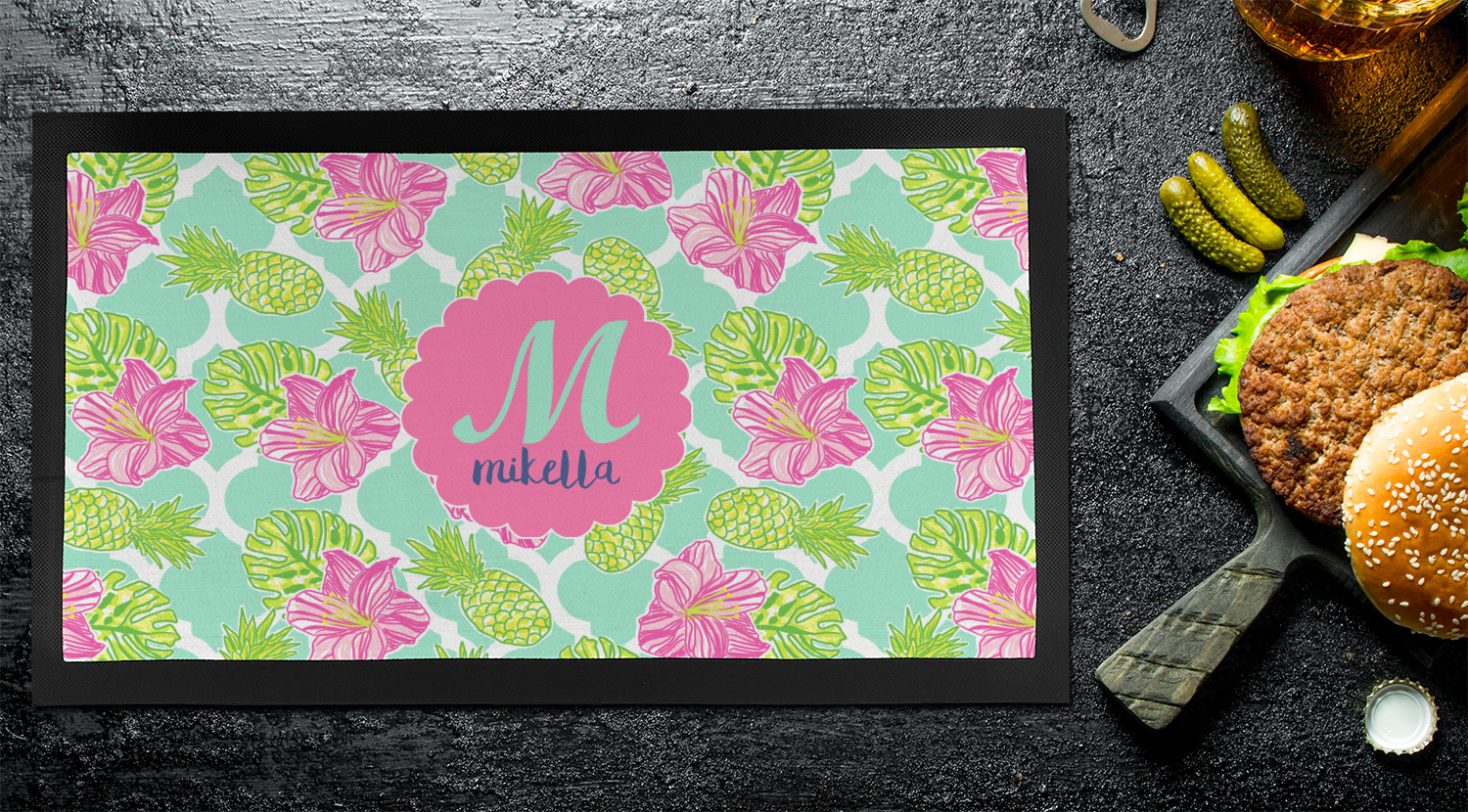 The background is a mint and white Moroccan lattice with brightly colored hibiscus flowers and pineapples. A scalloped frame sits in the center of the design with a fun name and initial personalization. With all of the fun bright yellows, greens, and pinks, you will just fawn over this design.