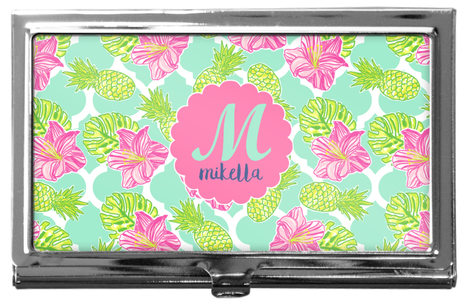The background is a mint and white Moroccan lattice with brightly colored hibiscus flowers and pineapples. A scalloped frame sits in the center of the design with a fun name and initial personalization. With all of the fun bright yellows, greens, and pinks, you will just fawn over this design.