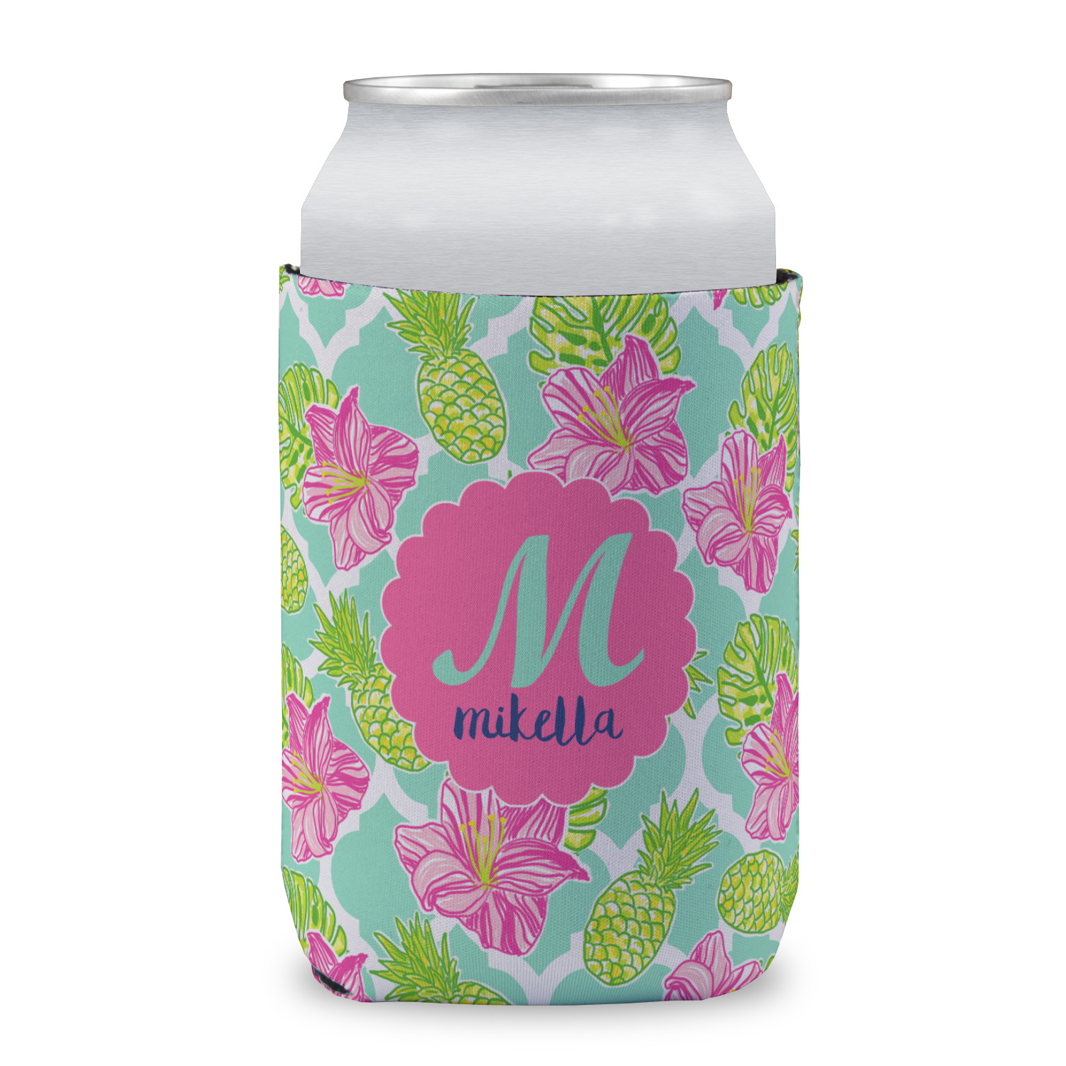 The background is a mint and white Moroccan lattice with brightly colored hibiscus flowers and pineapples. A scalloped frame sits in the center of the design with a fun name and initial personalization. With all of the fun bright yellows, greens, and pinks, you will just fawn over this design.