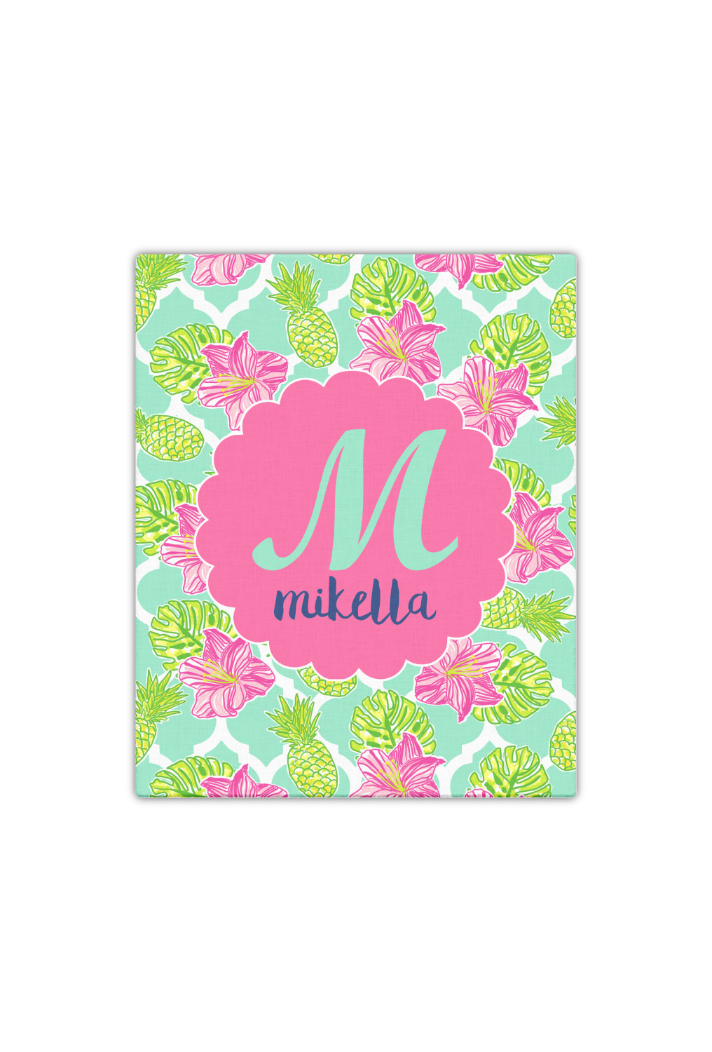 The background is a mint and white Moroccan lattice with brightly colored hibiscus flowers and pineapples. A scalloped frame sits in the center of the design with a fun name and initial personalization. With all of the fun bright yellows, greens, and pinks, you will just fawn over this design.