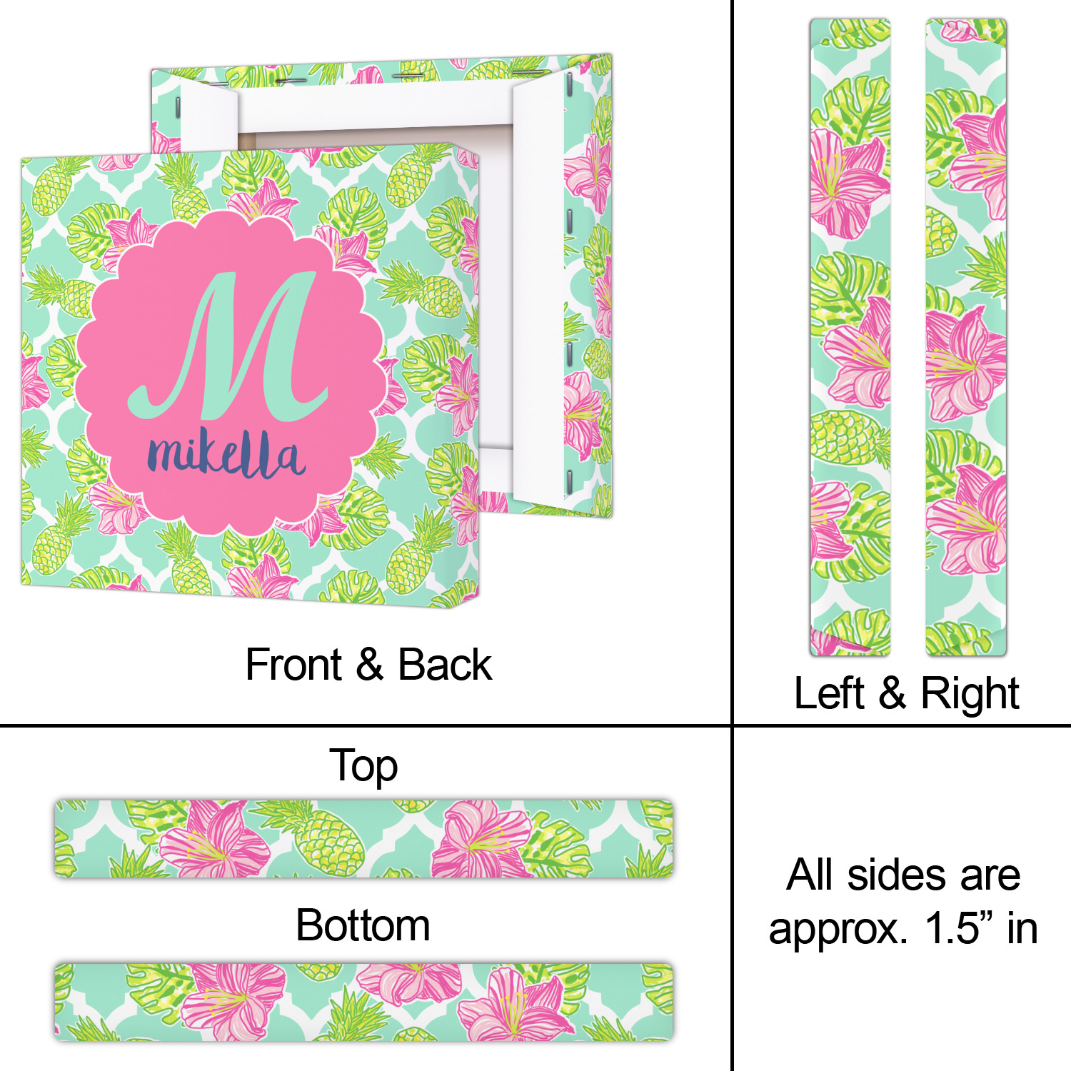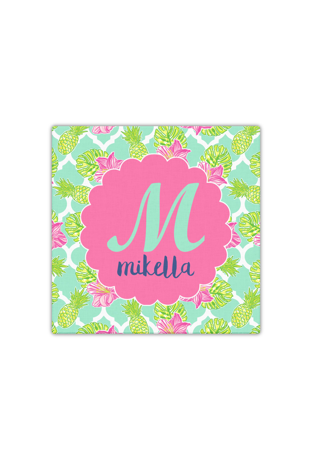 The background is a mint and white Moroccan lattice with brightly colored hibiscus flowers and pineapples. A scalloped frame sits in the center of the design with a fun name and initial personalization. With all of the fun bright yellows, greens, and pinks, you will just fawn over this design.