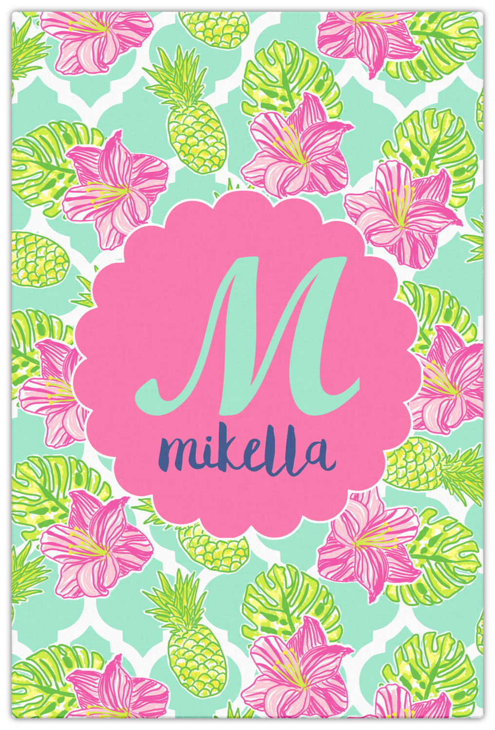 The background is a mint and white Moroccan lattice with brightly colored hibiscus flowers and pineapples. A scalloped frame sits in the center of the design with a fun name and initial personalization. With all of the fun bright yellows, greens, and pinks, you will just fawn over this design.