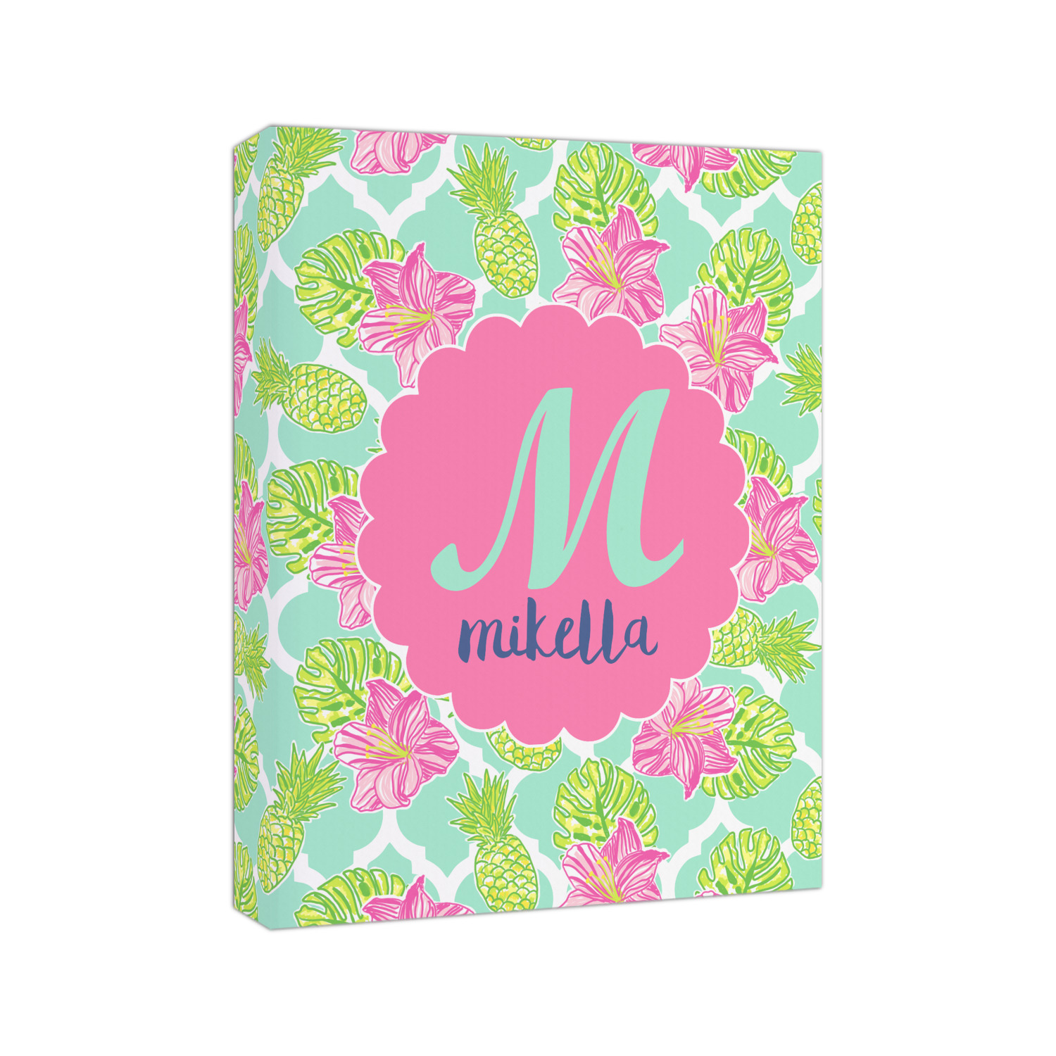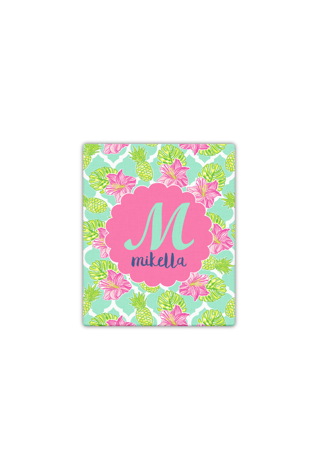 The background is a mint and white Moroccan lattice with brightly colored hibiscus flowers and pineapples. A scalloped frame sits in the center of the design with a fun name and initial personalization. With all of the fun bright yellows, greens, and pinks, you will just fawn over this design.