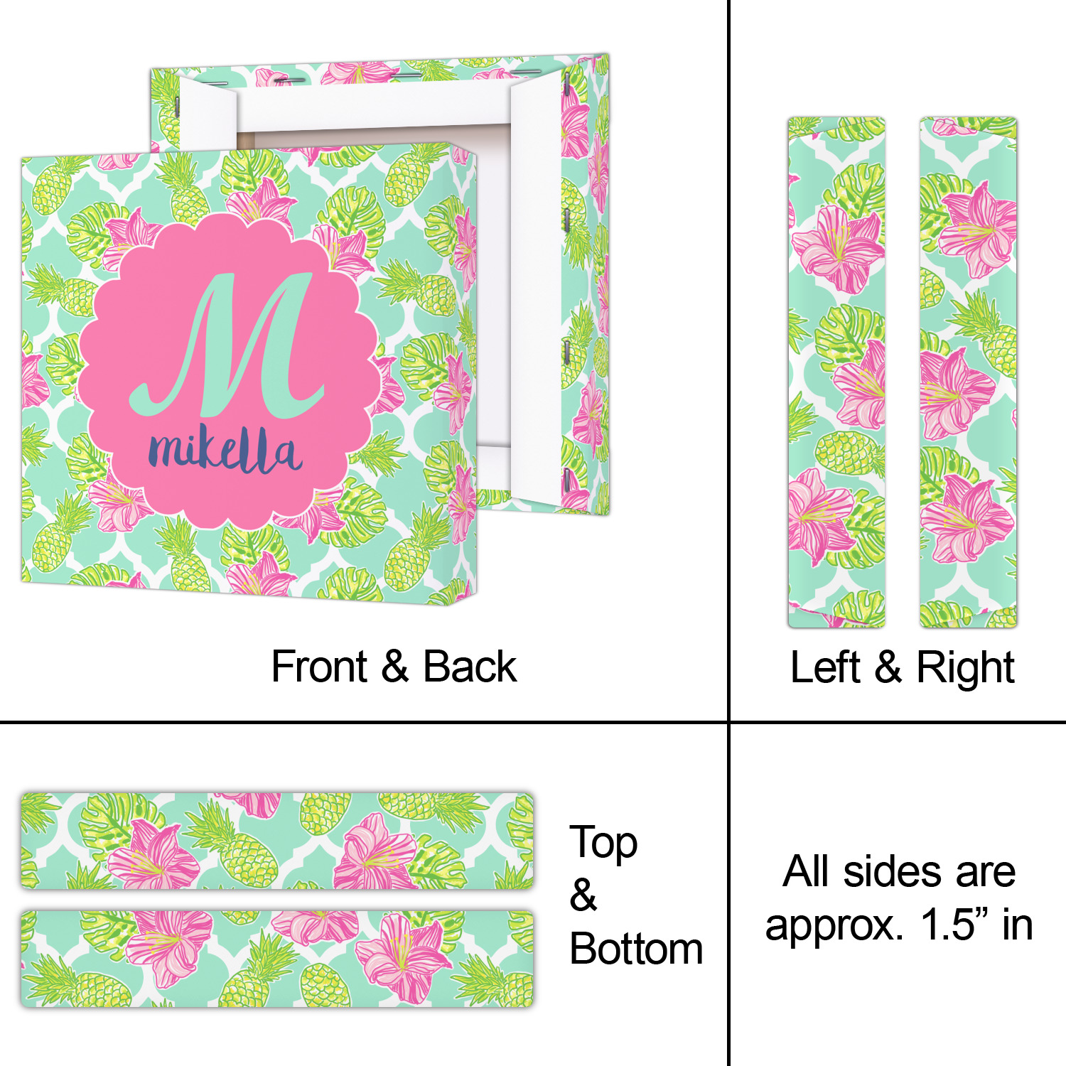The background is a mint and white Moroccan lattice with brightly colored hibiscus flowers and pineapples. A scalloped frame sits in the center of the design with a fun name and initial personalization. With all of the fun bright yellows, greens, and pinks, you will just fawn over this design.