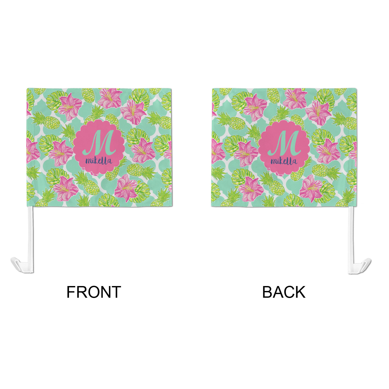 Our personalized flags are made from a durable, yet lightweight cloth that will proudly bear your logo or design of choice, while withstanding the outside elements. We have two size options - 8" x 11" and 11" x 15". Both come with a flag pole which includes a clip that secures the pole to the side window, whether it is rolled up or down. The flags are printed on both sides to display your design from all directions.