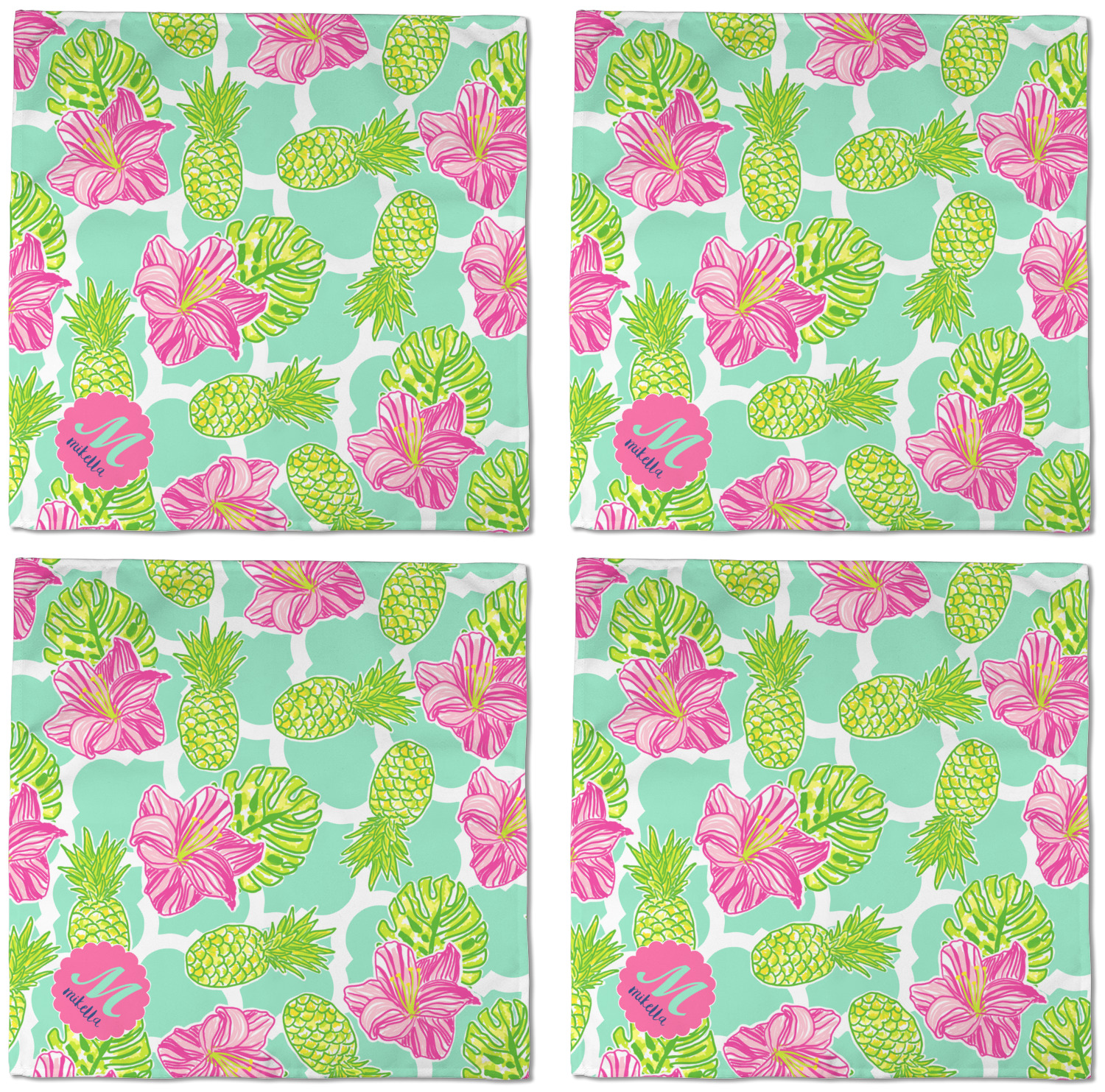 The background is a mint and white Moroccan lattice with brightly colored hibiscus flowers and pineapples. A scalloped frame sits in the center of the design with a fun name and initial personalization. With all of the fun bright yellows, greens, and pinks, you will just fawn over this design.