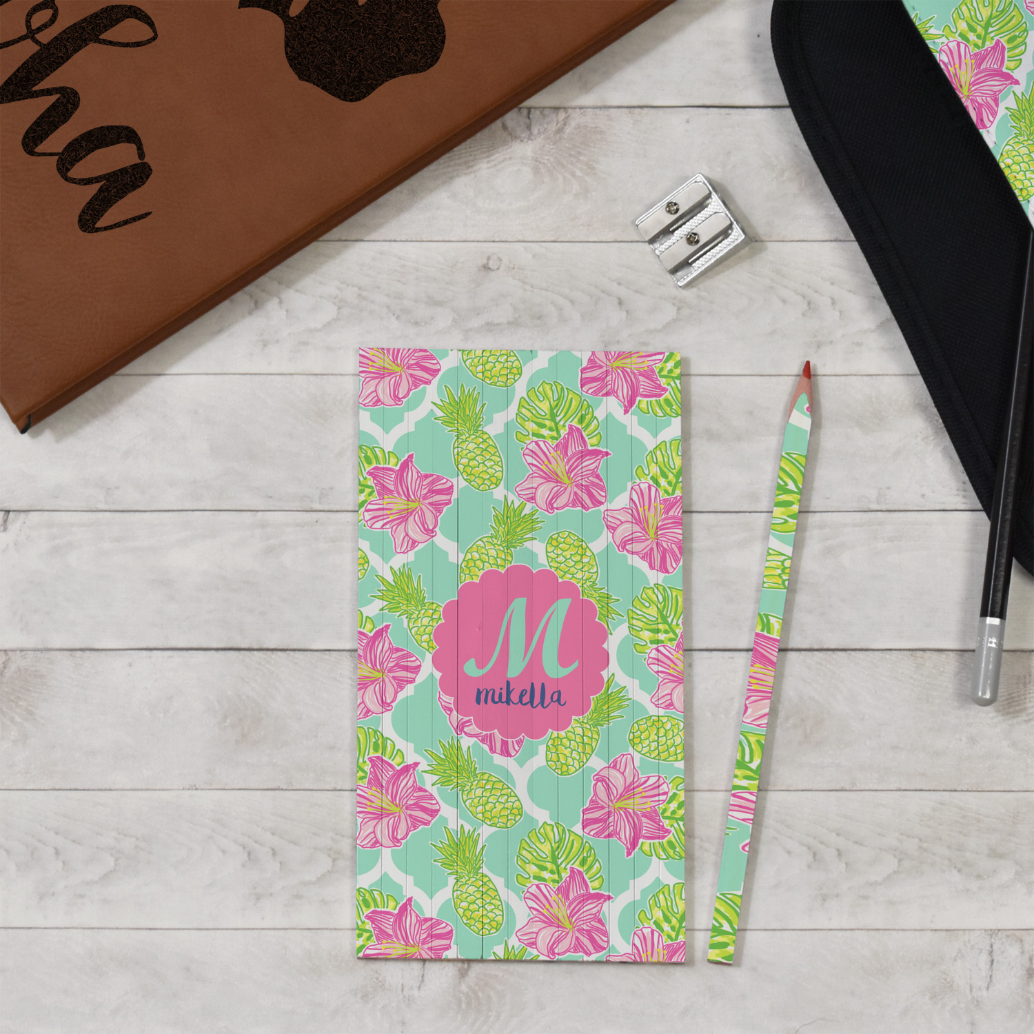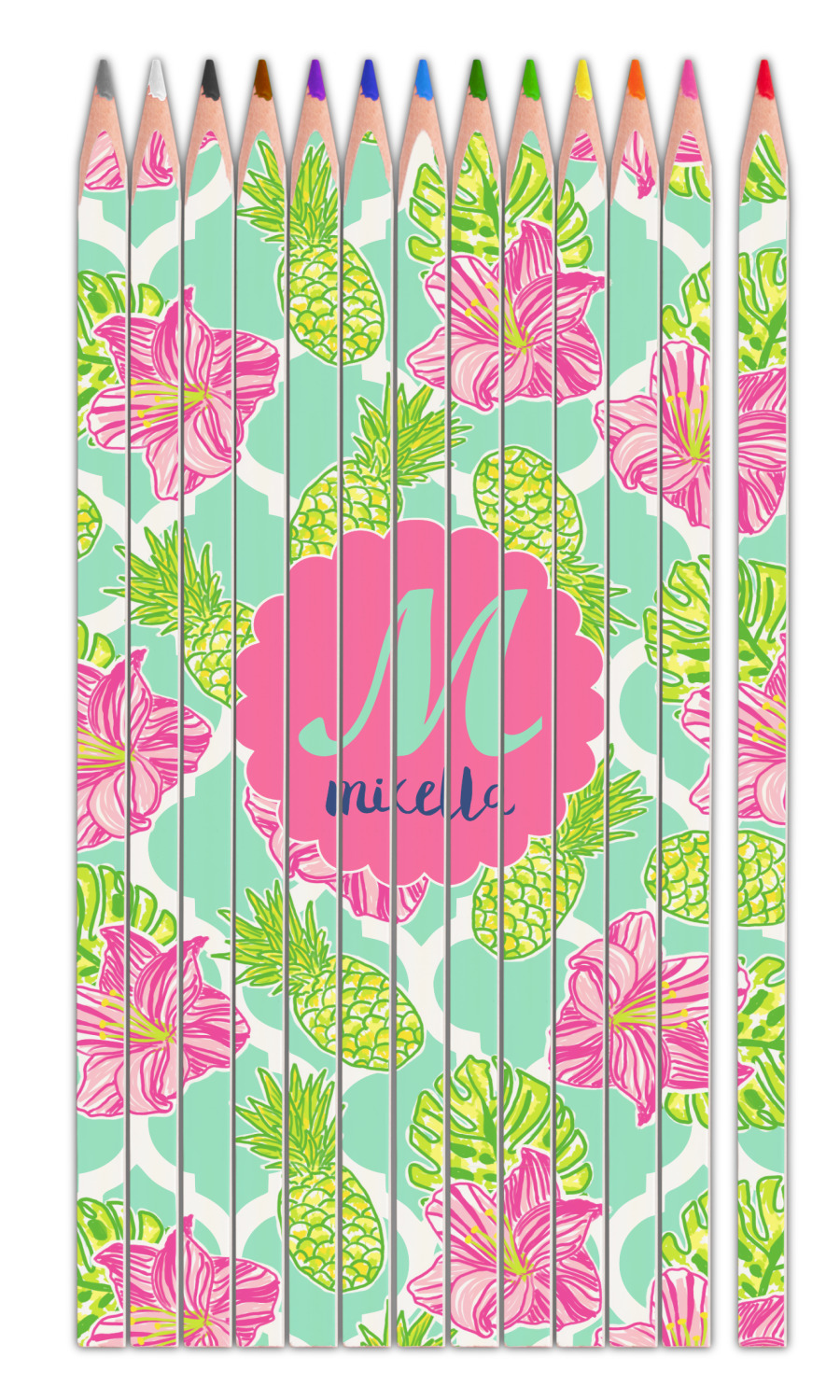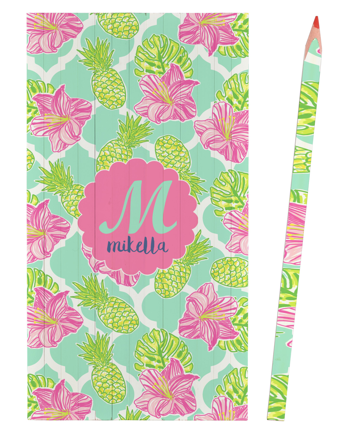 The background is a mint and white Moroccan lattice with brightly colored hibiscus flowers and pineapples. A scalloped frame sits in the center of the design with a fun name and initial personalization. With all of the fun bright yellows, greens, and pinks, you will just fawn over this design.