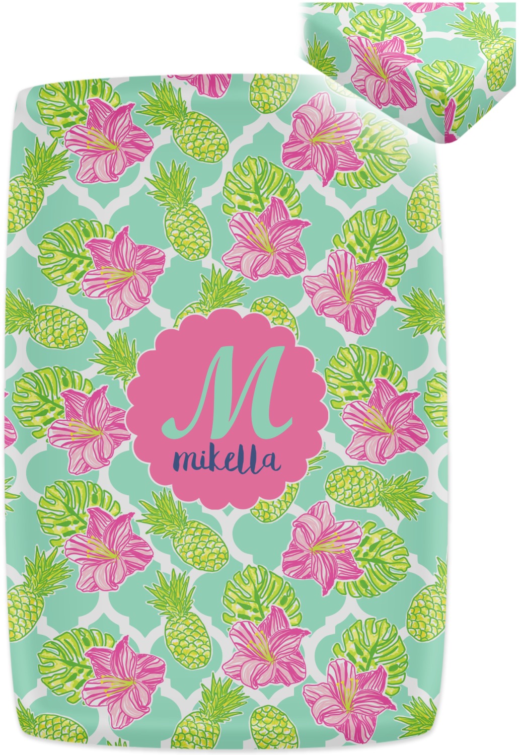 The background is a mint and white Moroccan lattice with brightly colored hibiscus flowers and pineapples. A scalloped frame sits in the center of the design with a fun name and initial personalization. With all of the fun bright yellows, greens, and pinks, you will just fawn over this design.