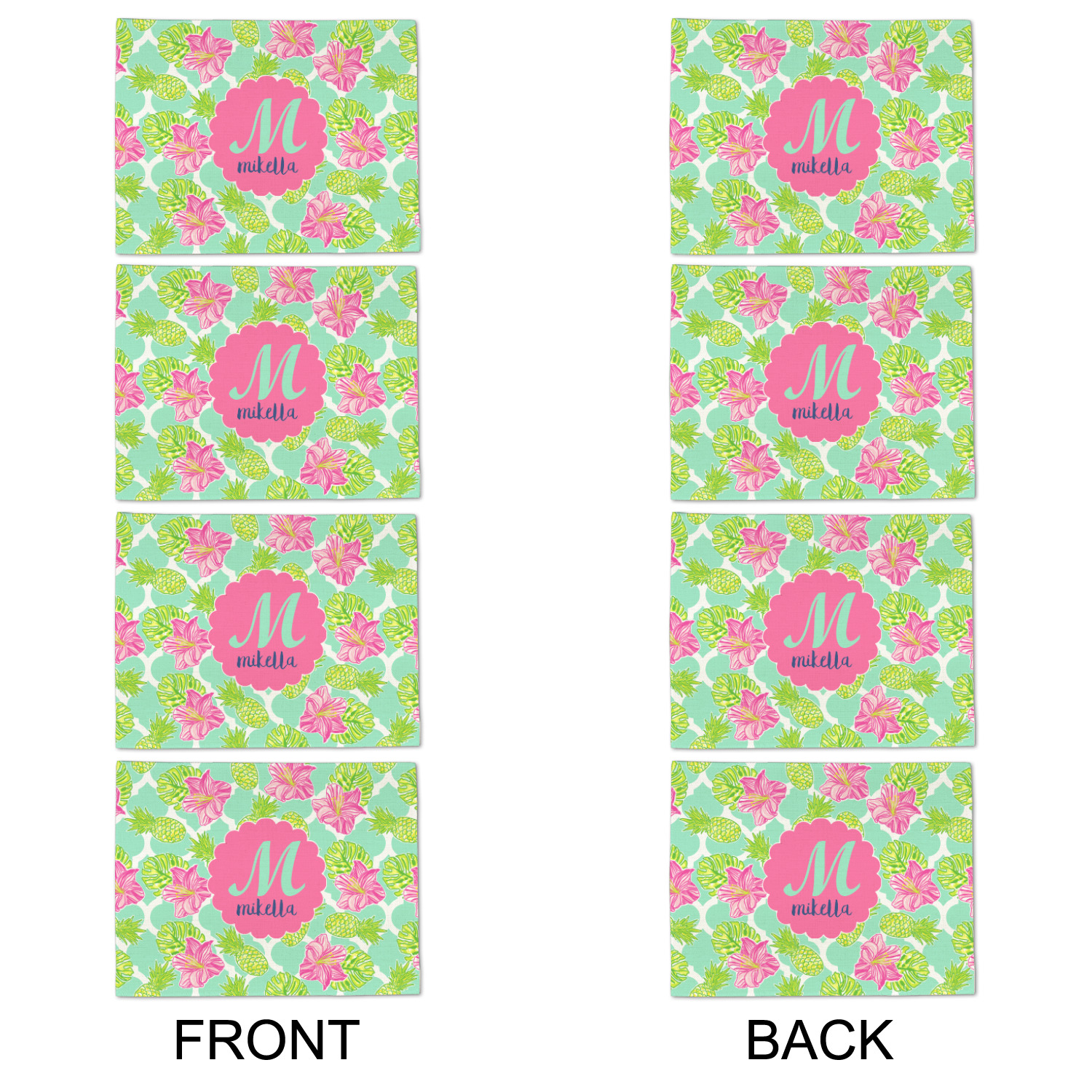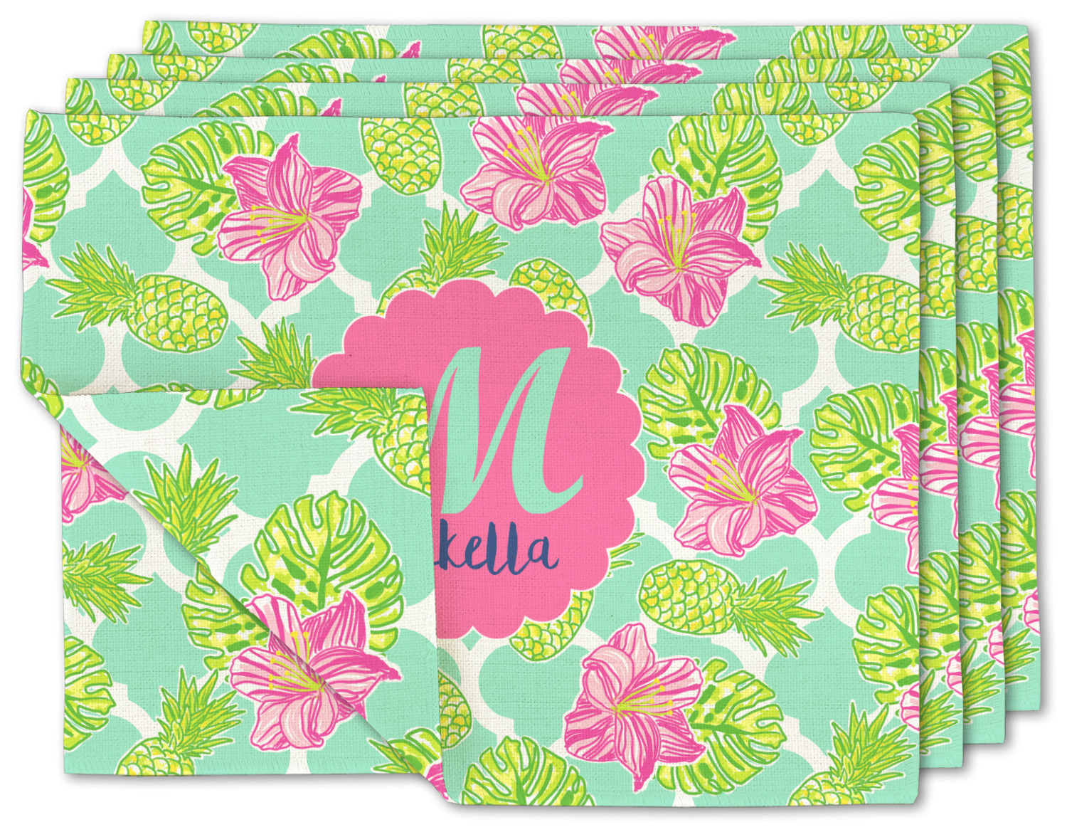 The background is a mint and white Moroccan lattice with brightly colored hibiscus flowers and pineapples. A scalloped frame sits in the center of the design with a fun name and initial personalization. With all of the fun bright yellows, greens, and pinks, you will just fawn over this design.