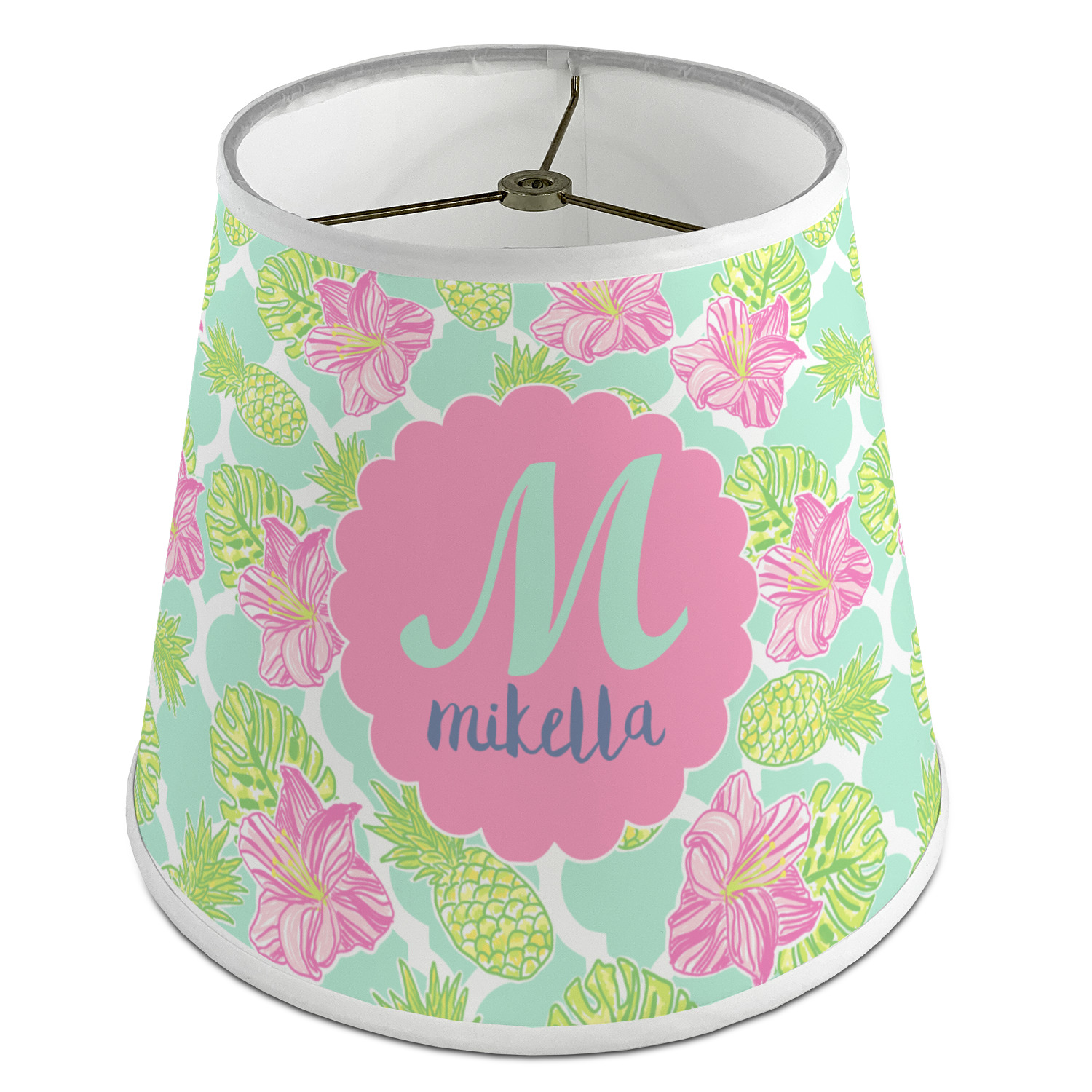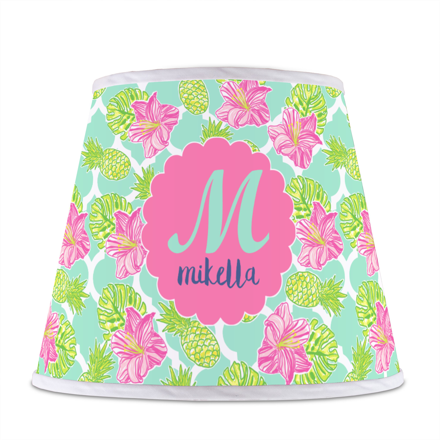 The background is a mint and white Moroccan lattice with brightly colored hibiscus flowers and pineapples. A scalloped frame sits in the center of the design with a fun name and initial personalization. With all of the fun bright yellows, greens, and pinks, you will just fawn over this design.