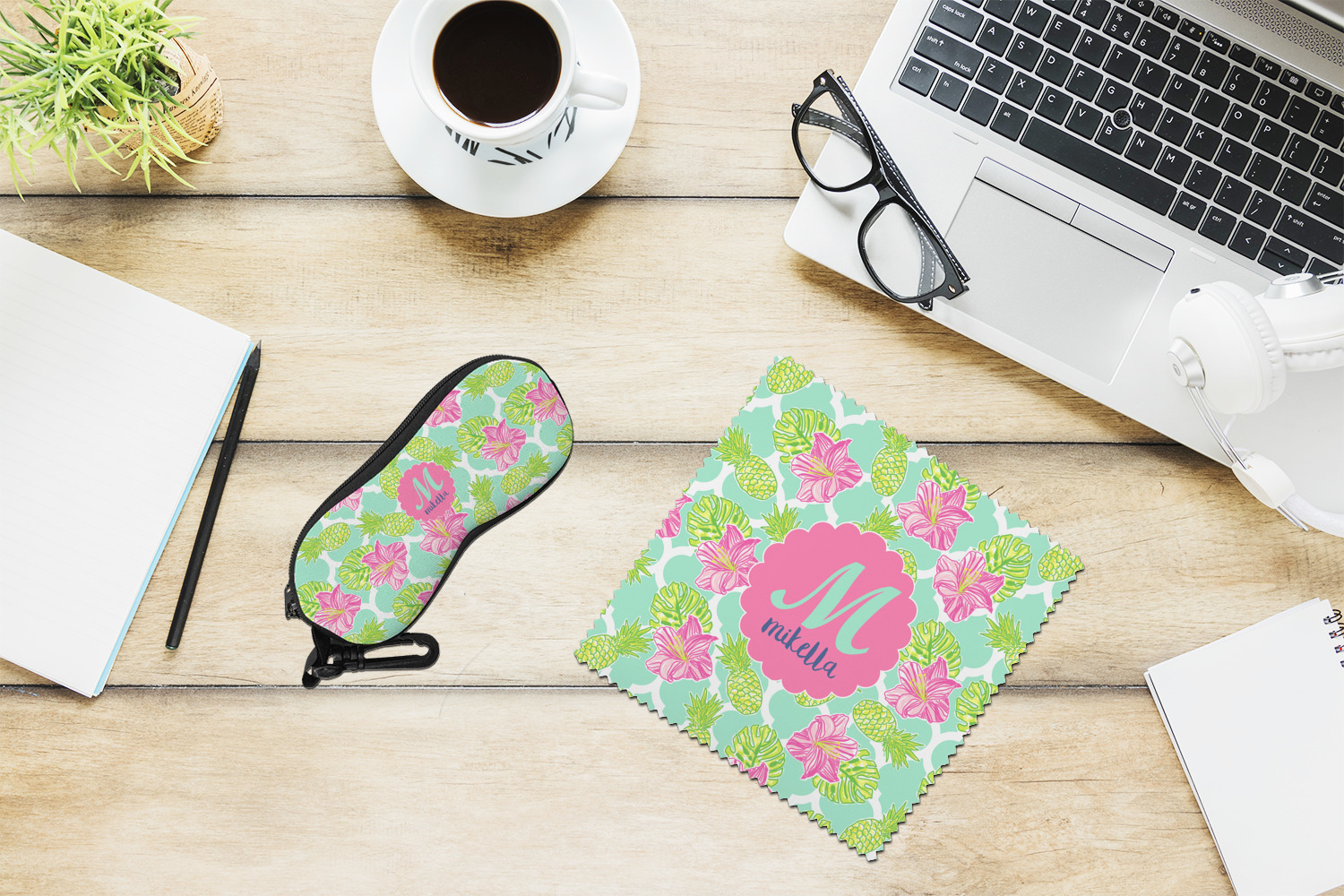 The background is a mint and white Moroccan lattice with brightly colored hibiscus flowers and pineapples. A scalloped frame sits in the center of the design with a fun name and initial personalization. With all of the fun bright yellows, greens, and pinks, you will just fawn over this design.