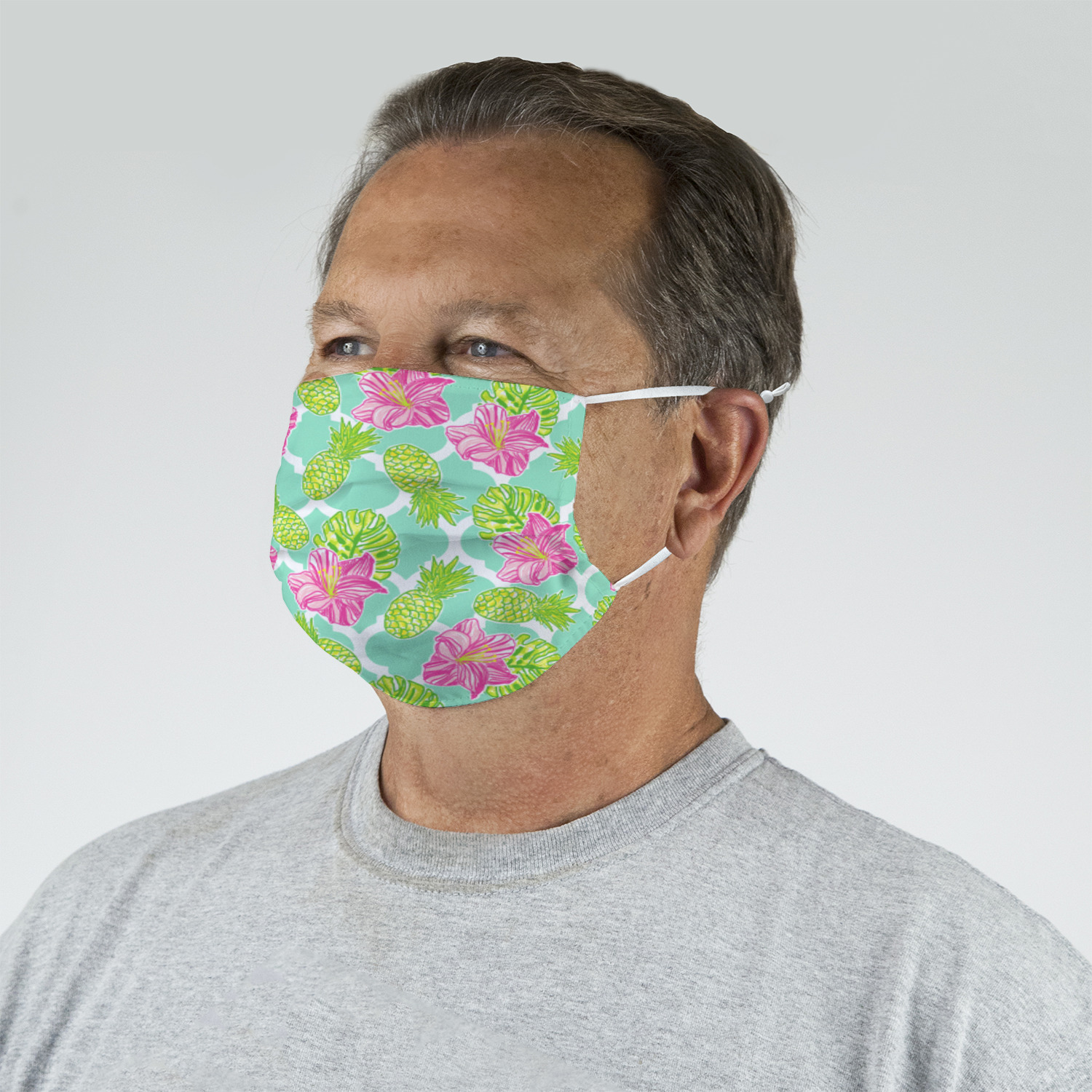 These fun face masks are 7" wide and 3.5" high. They feature pleats, adjustable ear loops, and are made with two layers of fabric. The top layer where your design is printed is a breathable polyester sheeting, while the inside layer is a soft microfiber polyester