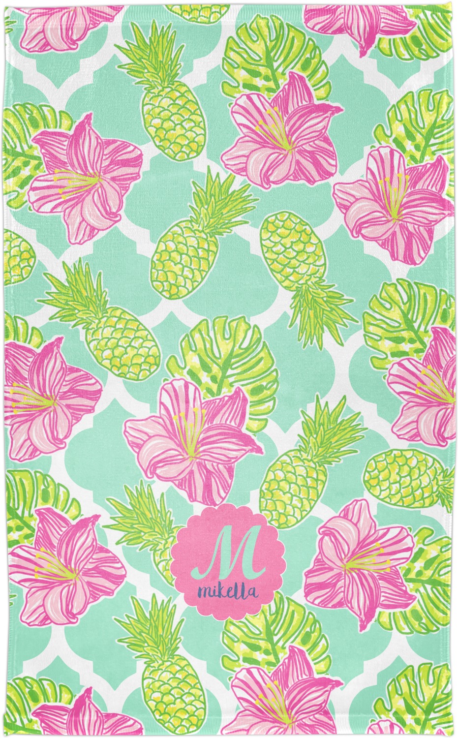 The background is a mint and white Moroccan lattice with brightly colored hibiscus flowers and pineapples. A scalloped frame sits in the center of the design with a fun name and initial personalization. With all of the fun bright yellows, greens, and pinks, you will just fawn over this design.