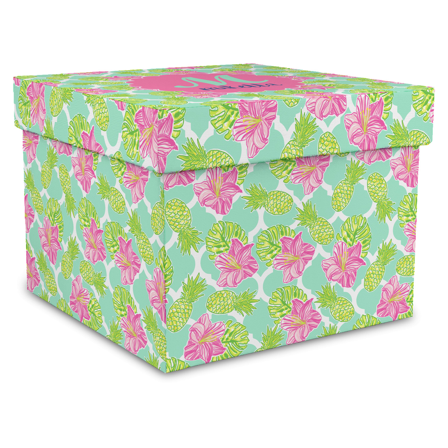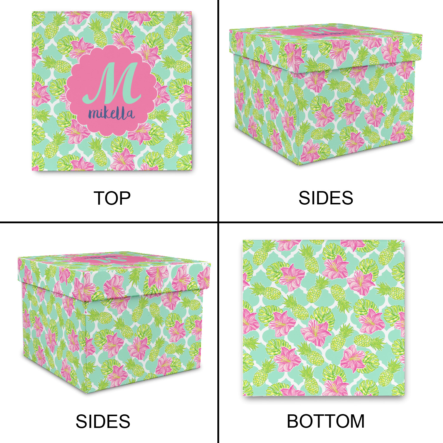 The background is a mint and white Moroccan lattice with brightly colored hibiscus flowers and pineapples. A scalloped frame sits in the center of the design with a fun name and initial personalization. With all of the fun bright yellows, greens, and pinks, you will just fawn over this design.