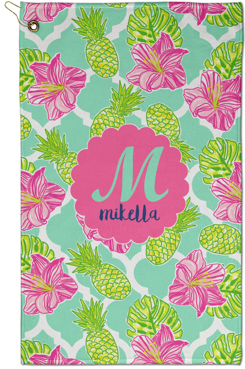 The background is a mint and white Moroccan lattice with brightly colored hibiscus flowers and pineapples. A scalloped frame sits in the center of the design with a fun name and initial personalization. With all of the fun bright yellows, greens, and pinks, you will just fawn over this design.
